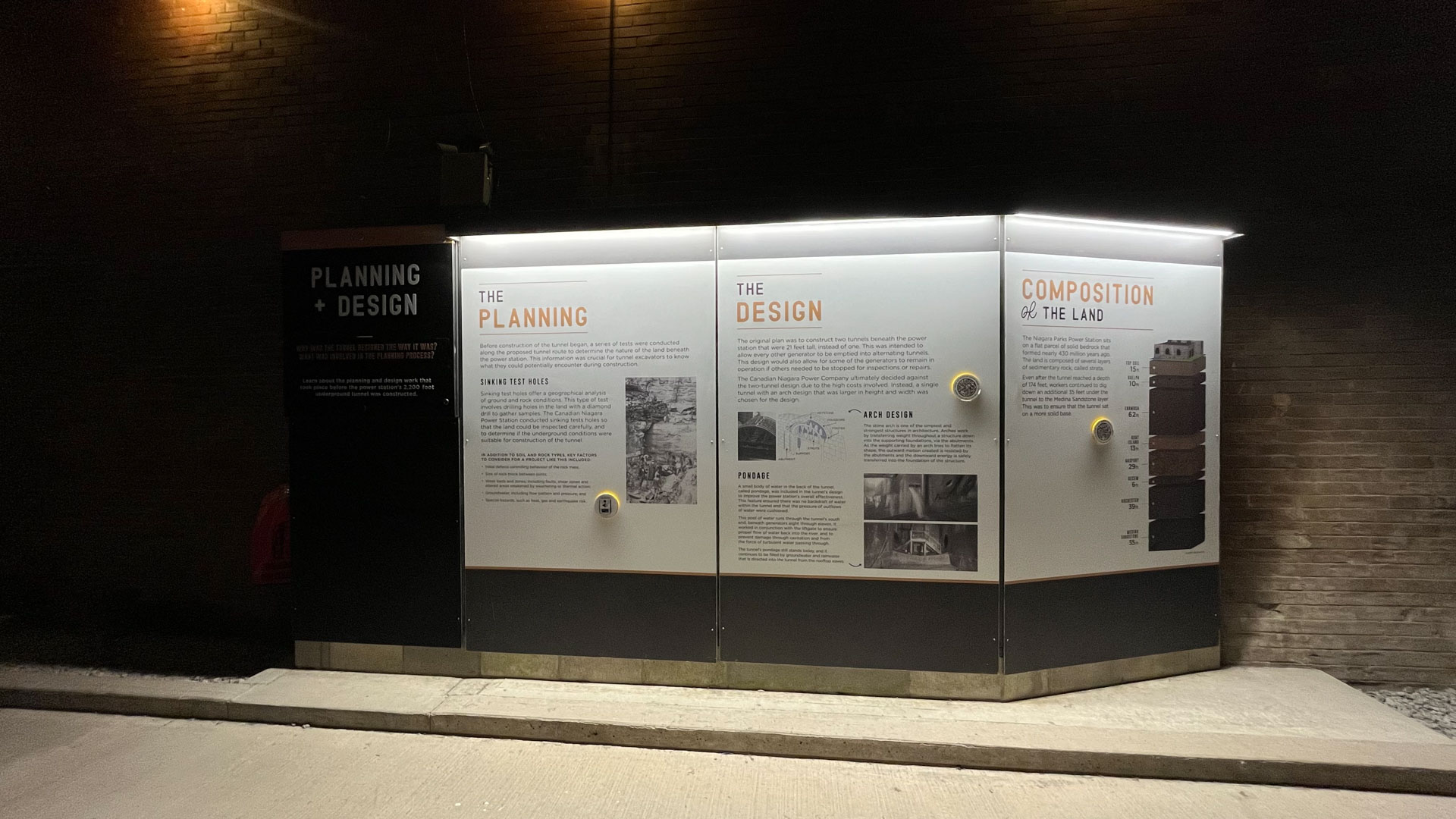 We did the Tunnel before we toured the power station. We both enjoyed it. They take you down 180 feet in an elevator with windows that allow you to see lit up areas of the underground mechanisms of the power station. Once you get to the bottom and get off the elevator you arrive in the 2,200 foot long tunnel, which is where the water used to flow out from the power station back into the Niagara River. They’ve placed signs along the way on the walls for you to read that explain interesting facts about the power plant. There are also some benches along the way for people to rest on as well an informative video that’s projected onto part of the tunnel’s wall.