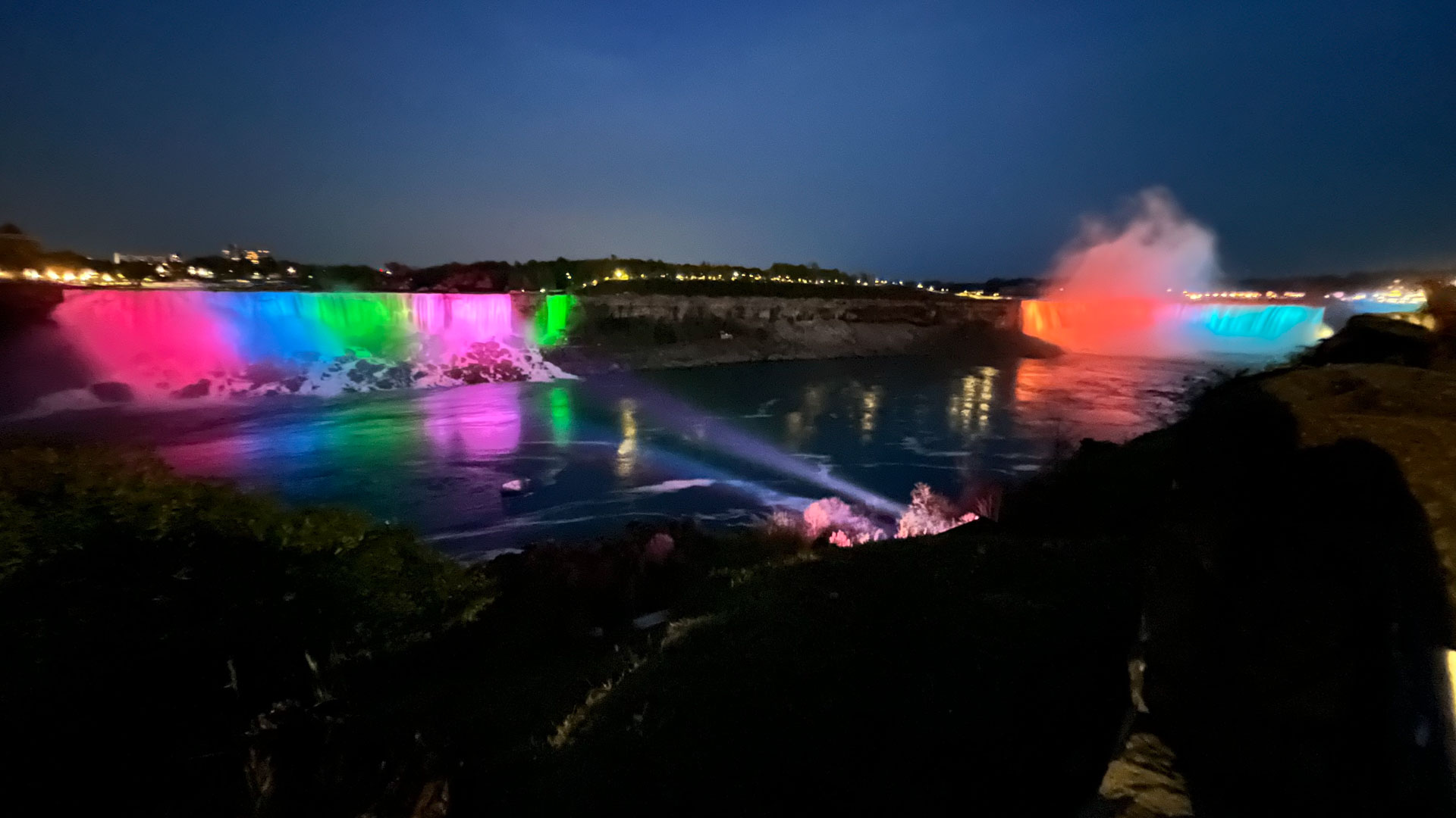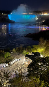 Then we found a bench to relax on in front of Queen Victoria Place Restaurant as we waited for the falls to be lit up at night (Niagara Falls Illumination.) It was a long wait of over an hour because the colored lights shining on the falls don’t start standing out until a bit after sunset, but it was worth the wait. The illumination of the falls is so beautiful. They do different colors with each lasting long enough for you to get plenty of photos of each color display.