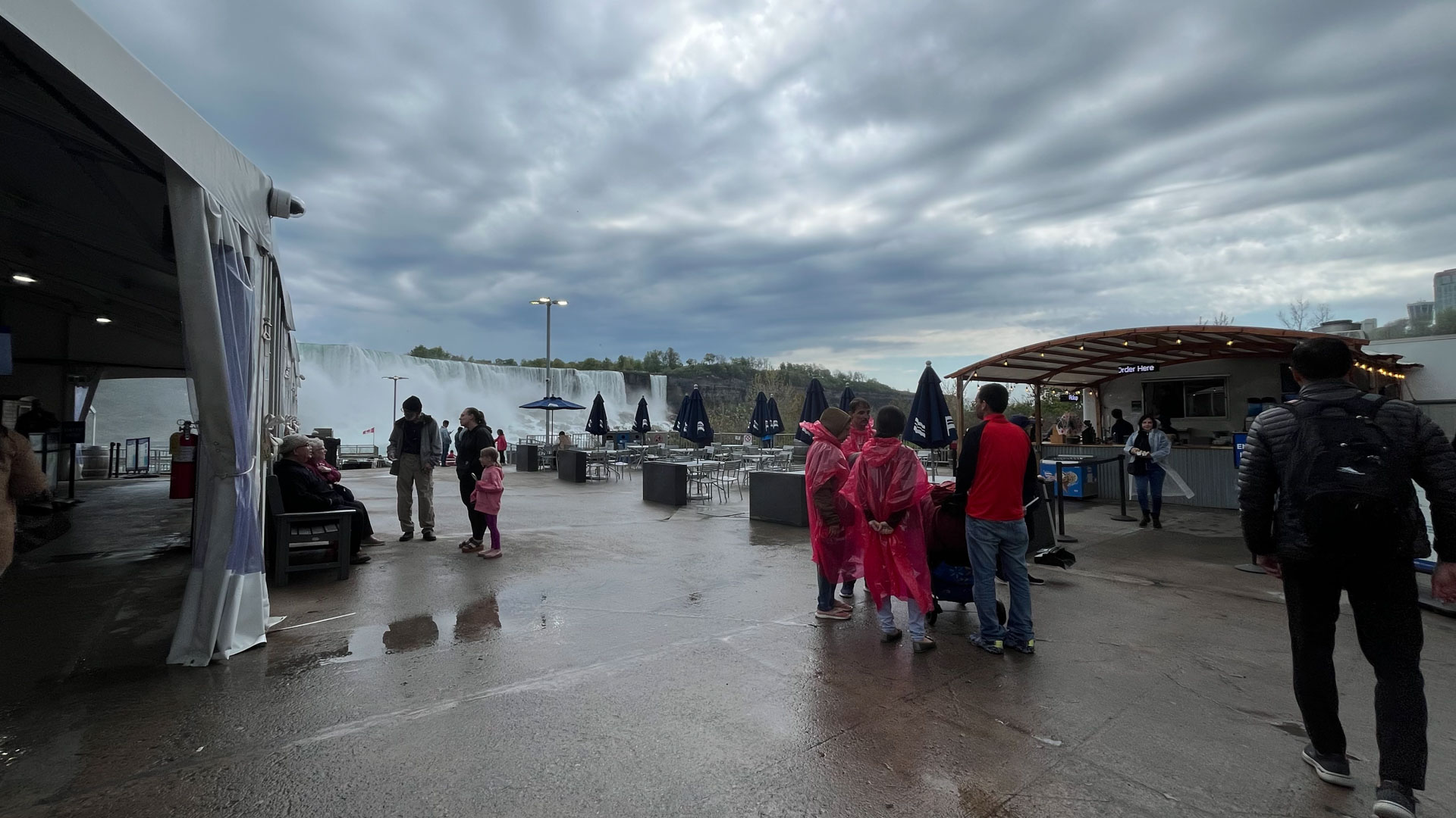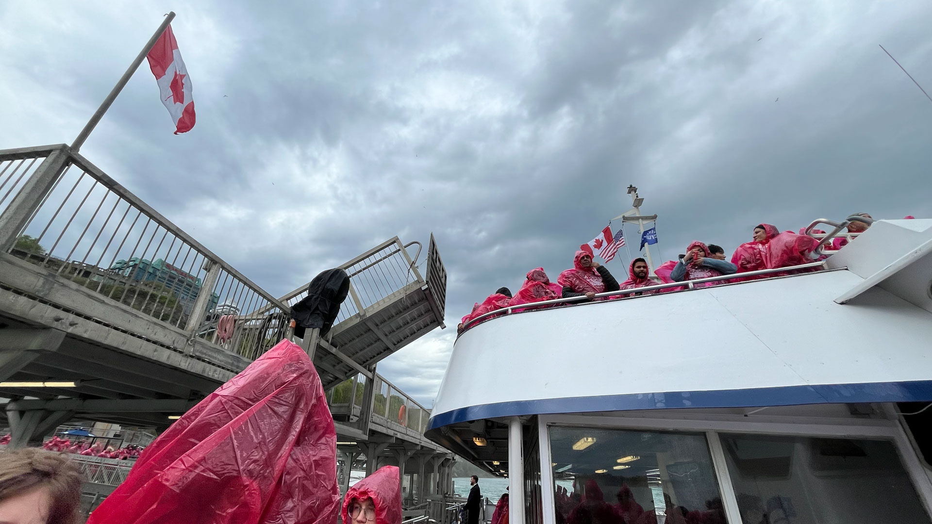 As we waited in the covered area we put our rain suits and rubber shoe covers on. They provide plastic ponchos, but we could tell later on from looking at everyone around us on the boat that the rain ponchos they hand out don’t provide much protection from the waters of the falls. It’s not just a mist that gets on you – waves of water splash up onto you if you’re on the first level of the boat. But more on that fun in a little bit!
