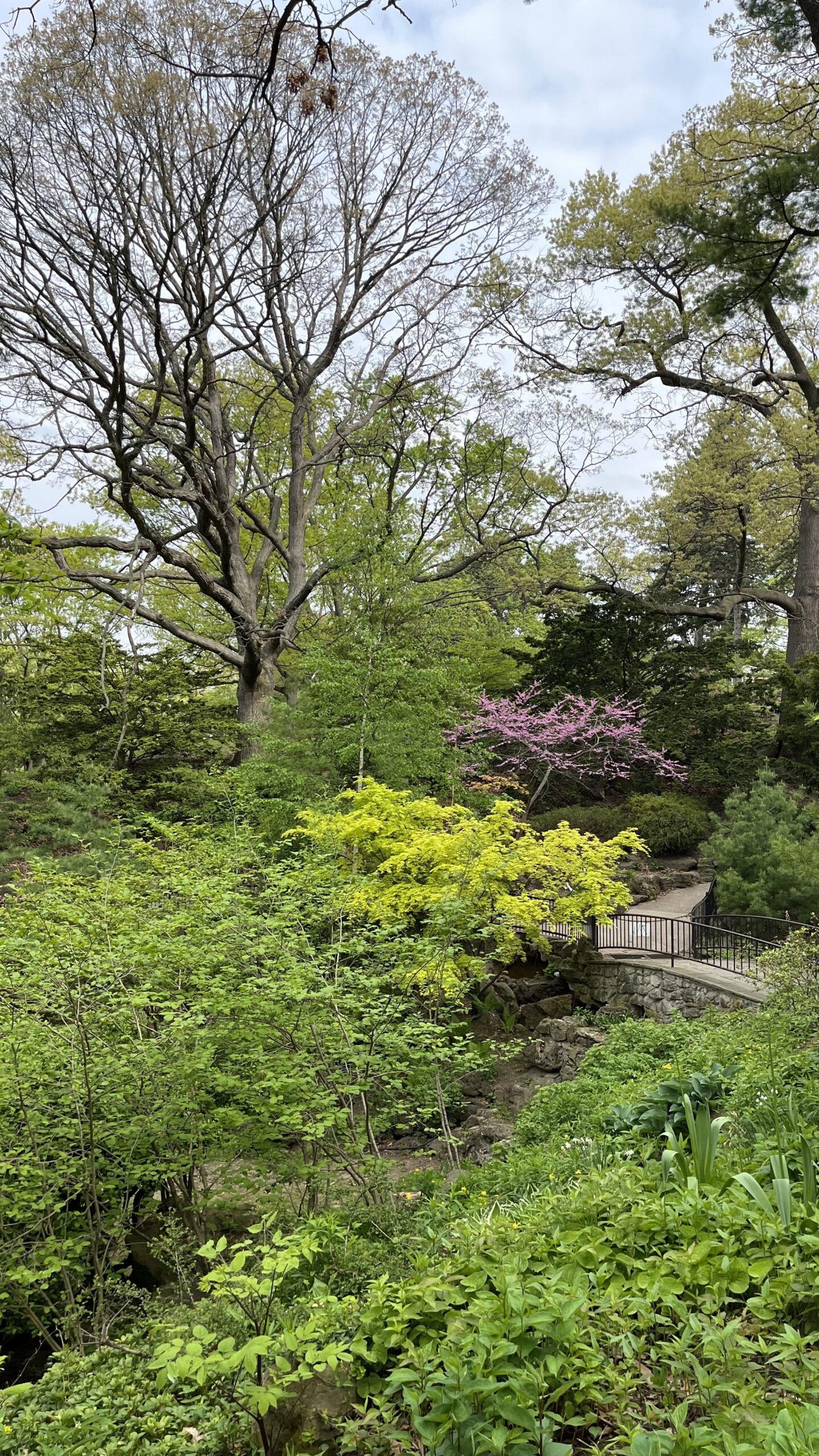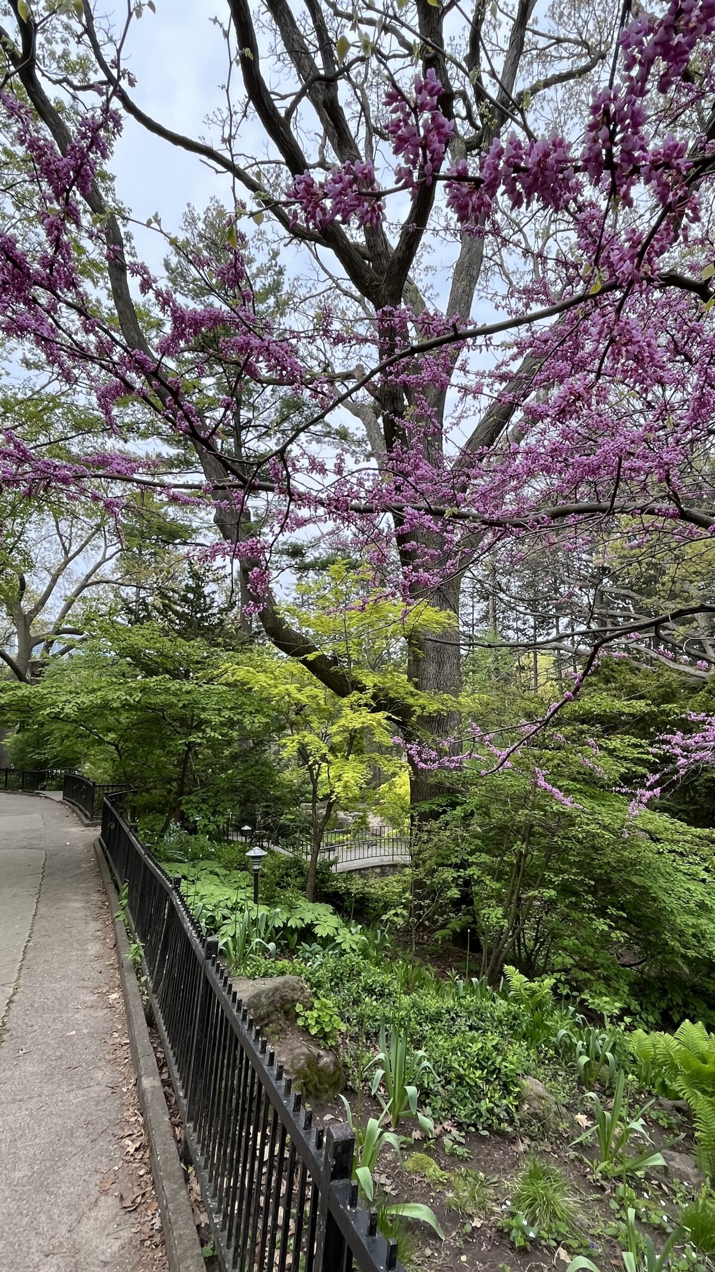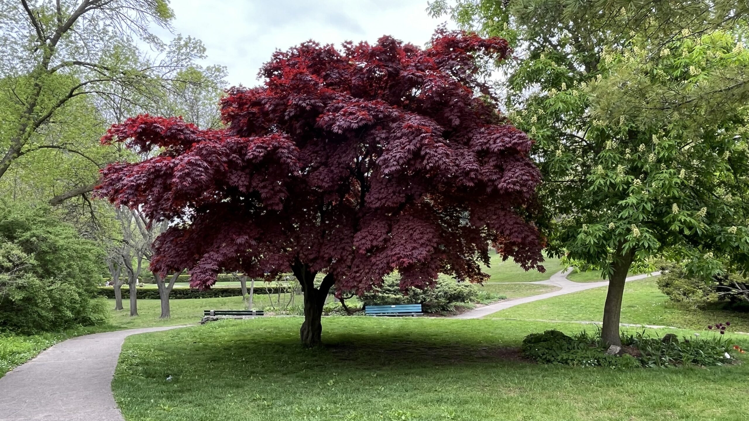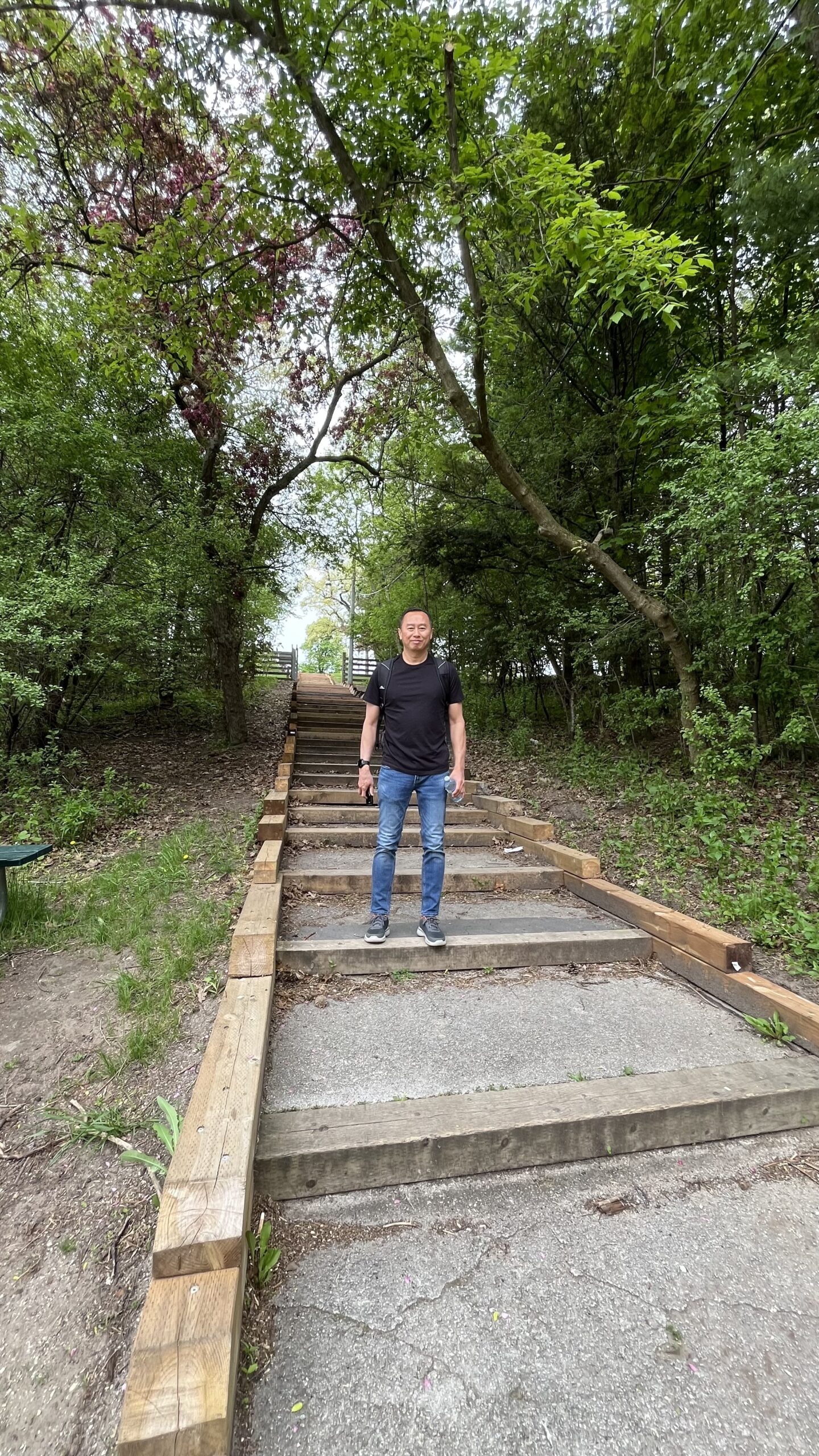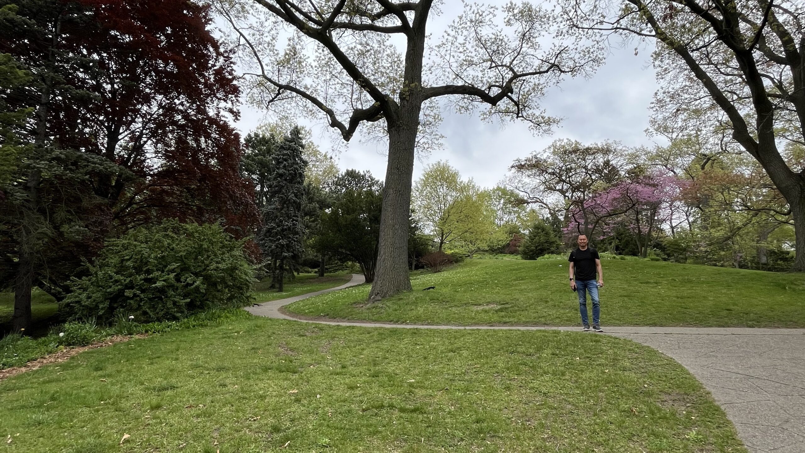 Trees, bushes, grass, walkways and my husband in High Park, Toronto, ON, Canada