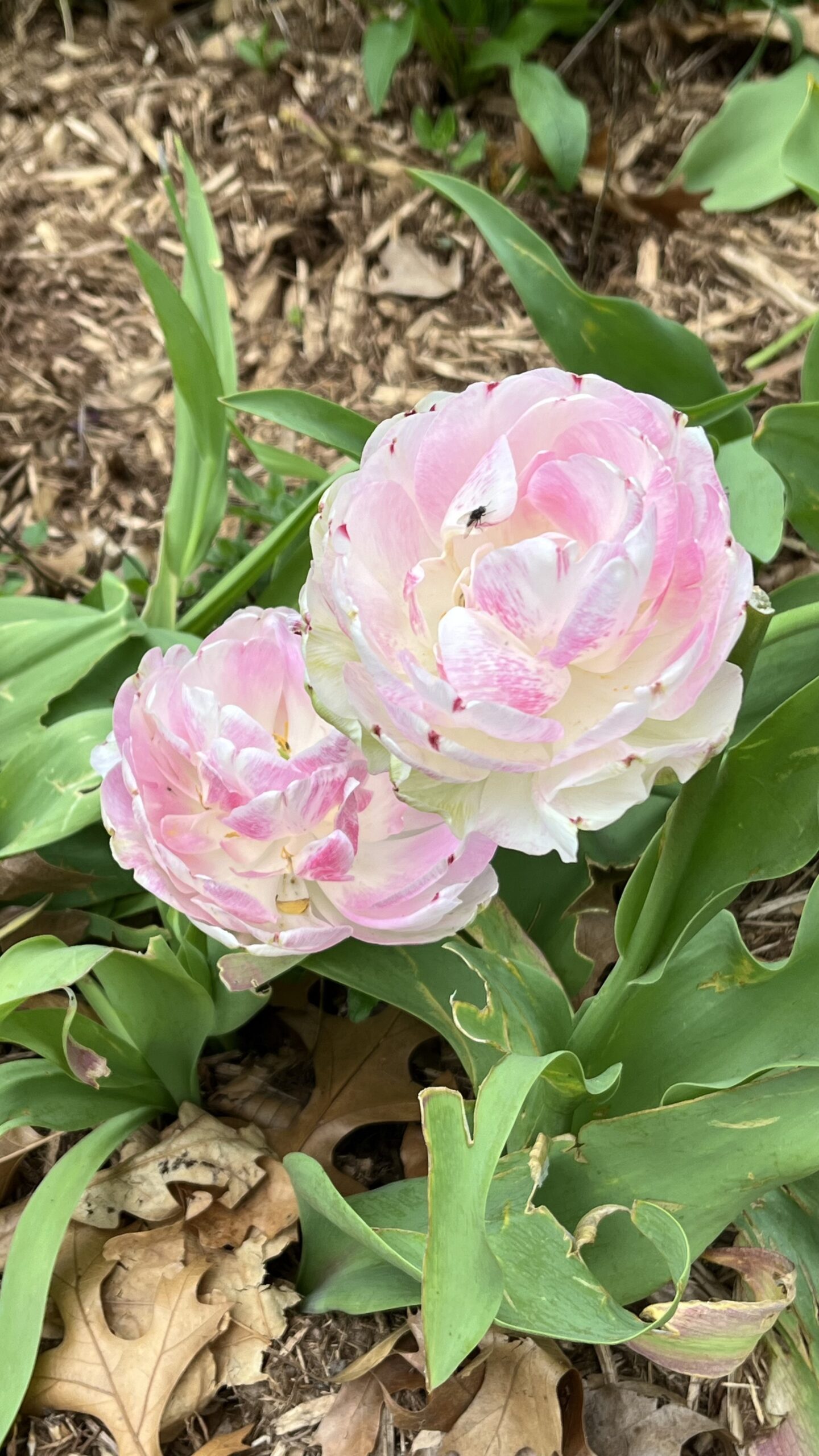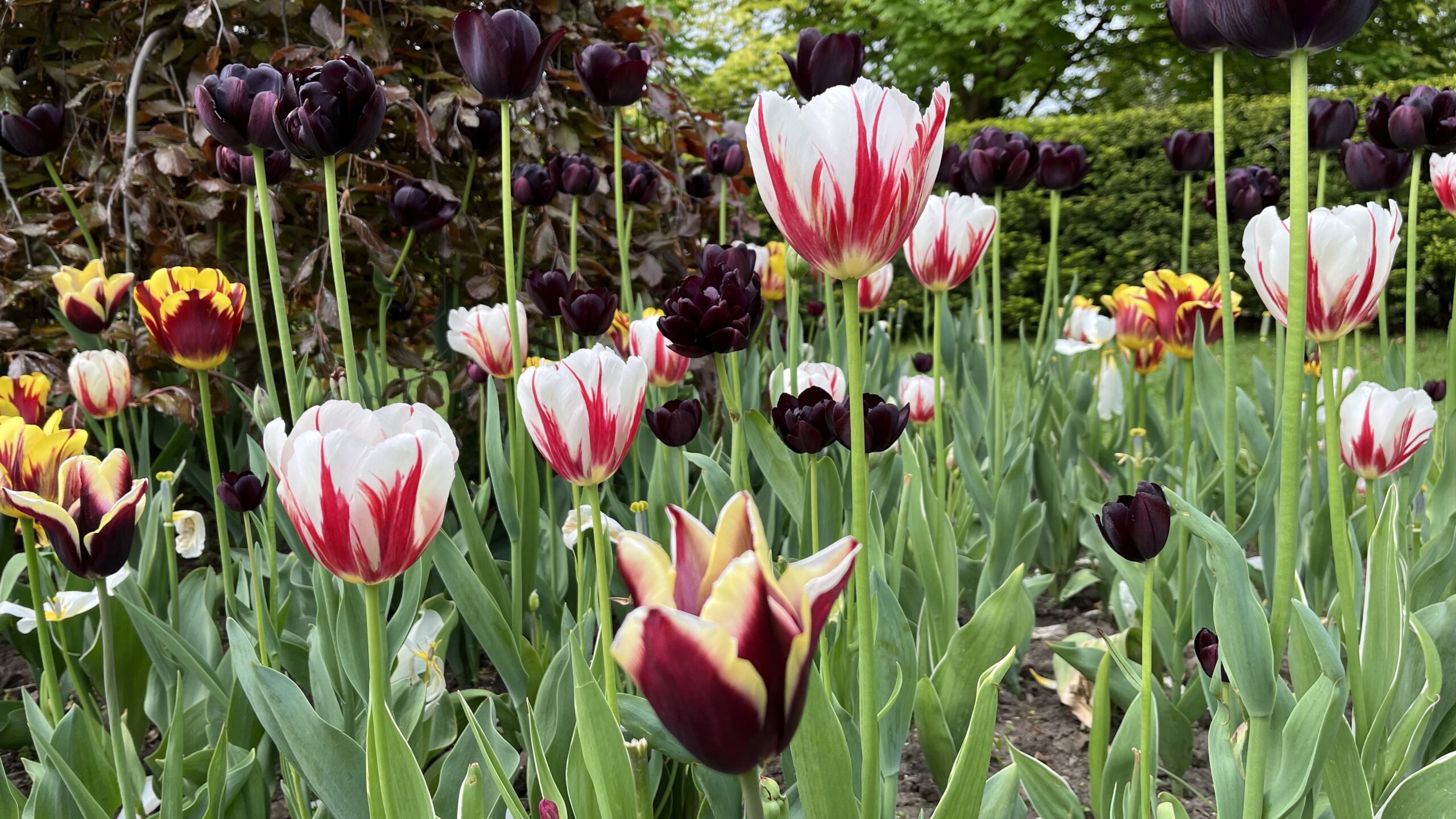 Nearby was a hedged in area with small flower beds that were each filled with tulips.