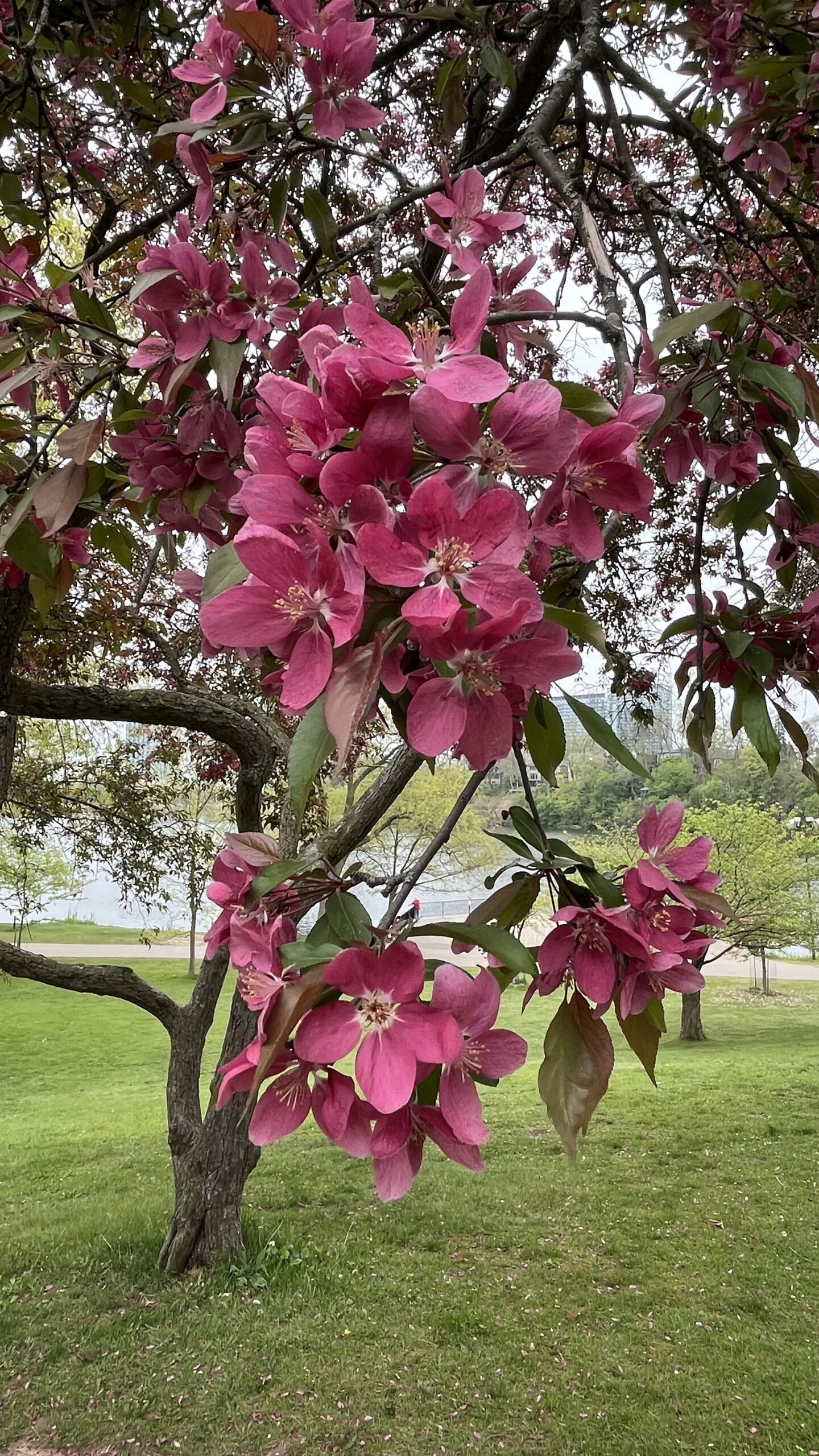 Tree with blooming dark pink flowers in High Park, Toronto, ON, Canada