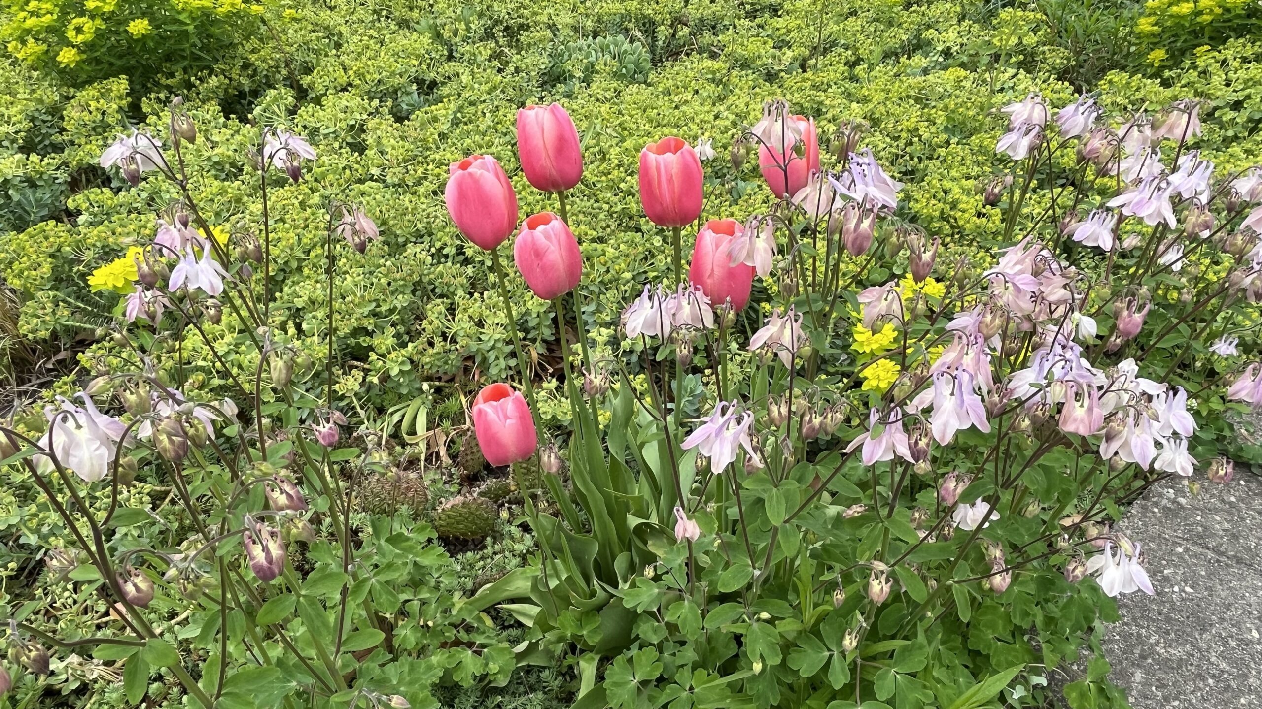 Magenta flowers, dainty white flowers, yellow flowers ad pink flowers in High Park, Toronto, ON, Canada