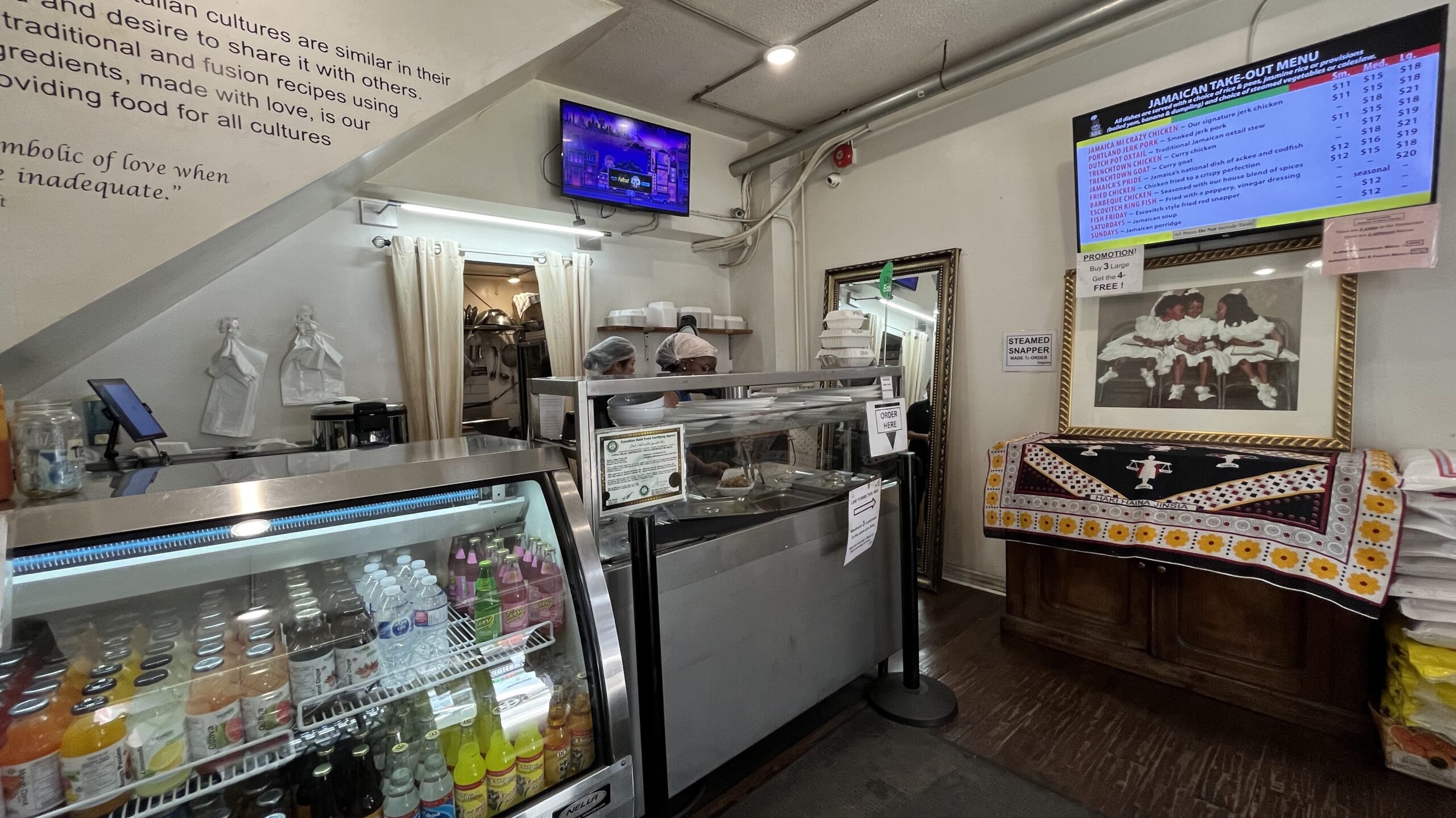 Display cases, small seating area, and menu with a nice variety of sweet and savory baked goods at Hong Kong Island Dim Sum House, Chinatown, Toronto, ON, Canada