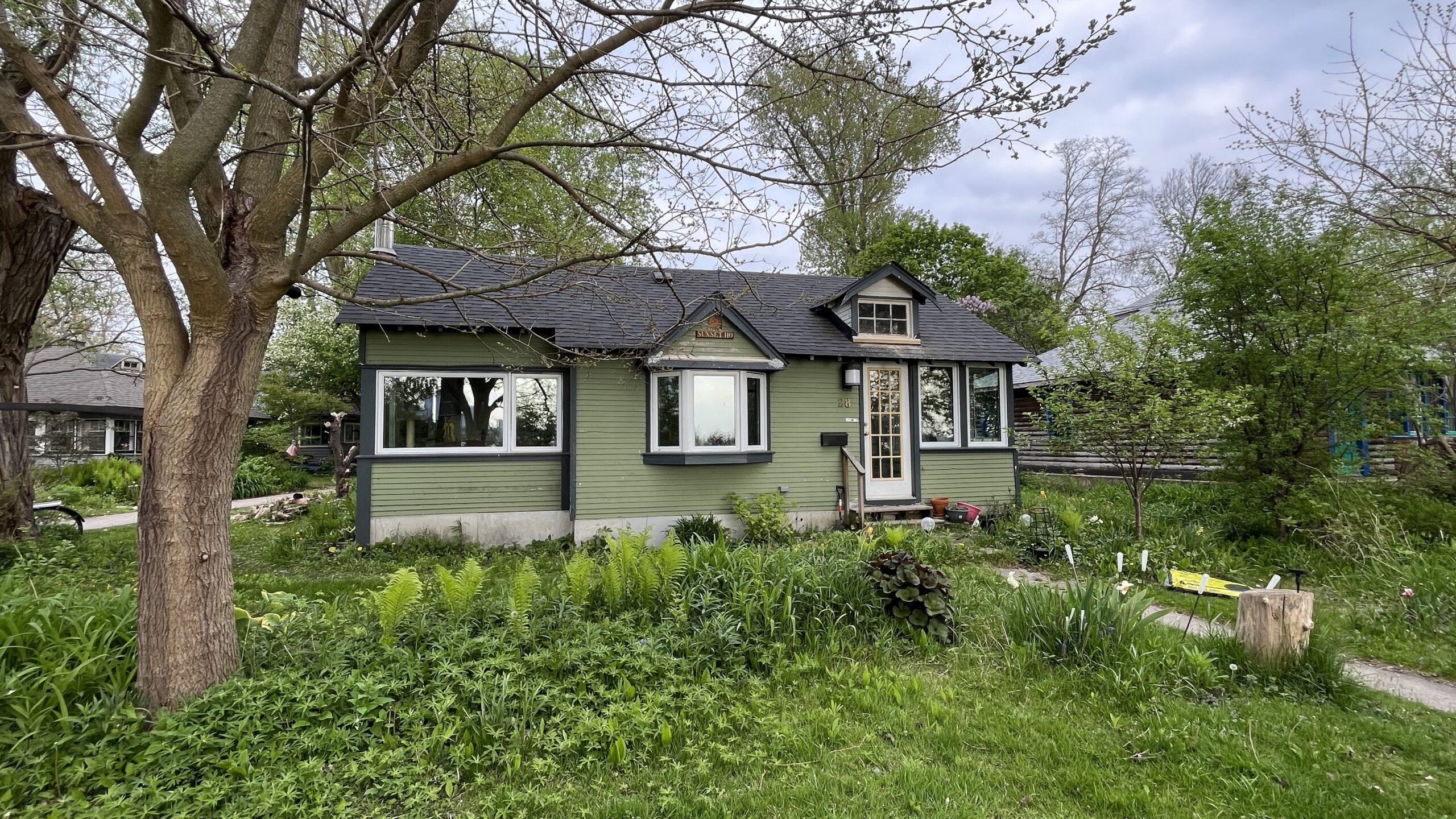A small, sage green home on Wards Island, Toronto Islands, Toronto, ON, Canada