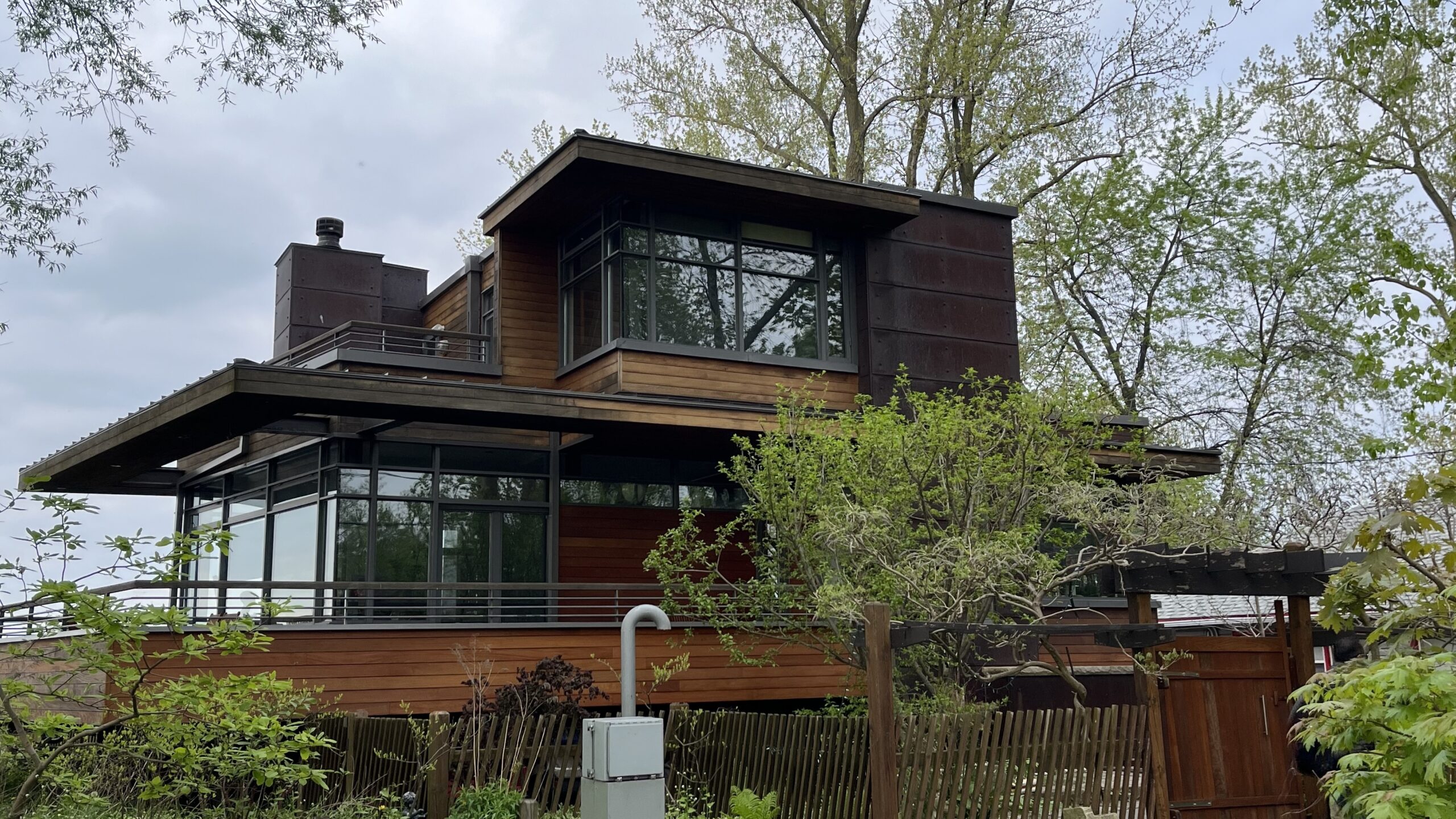 A brown, wooden, modern style home on Wards Island, Toronto Islands, Toronto, ON, Canada