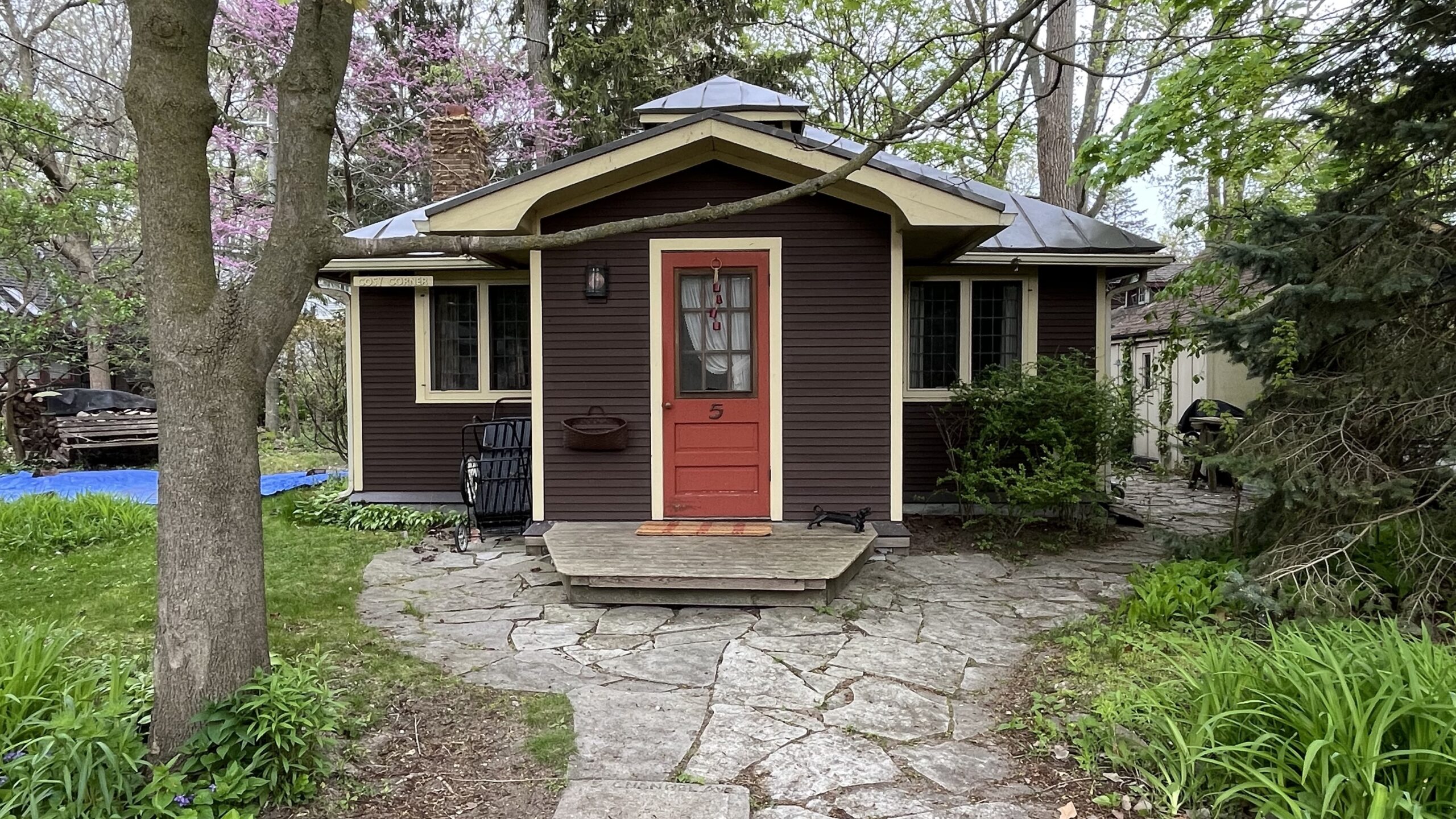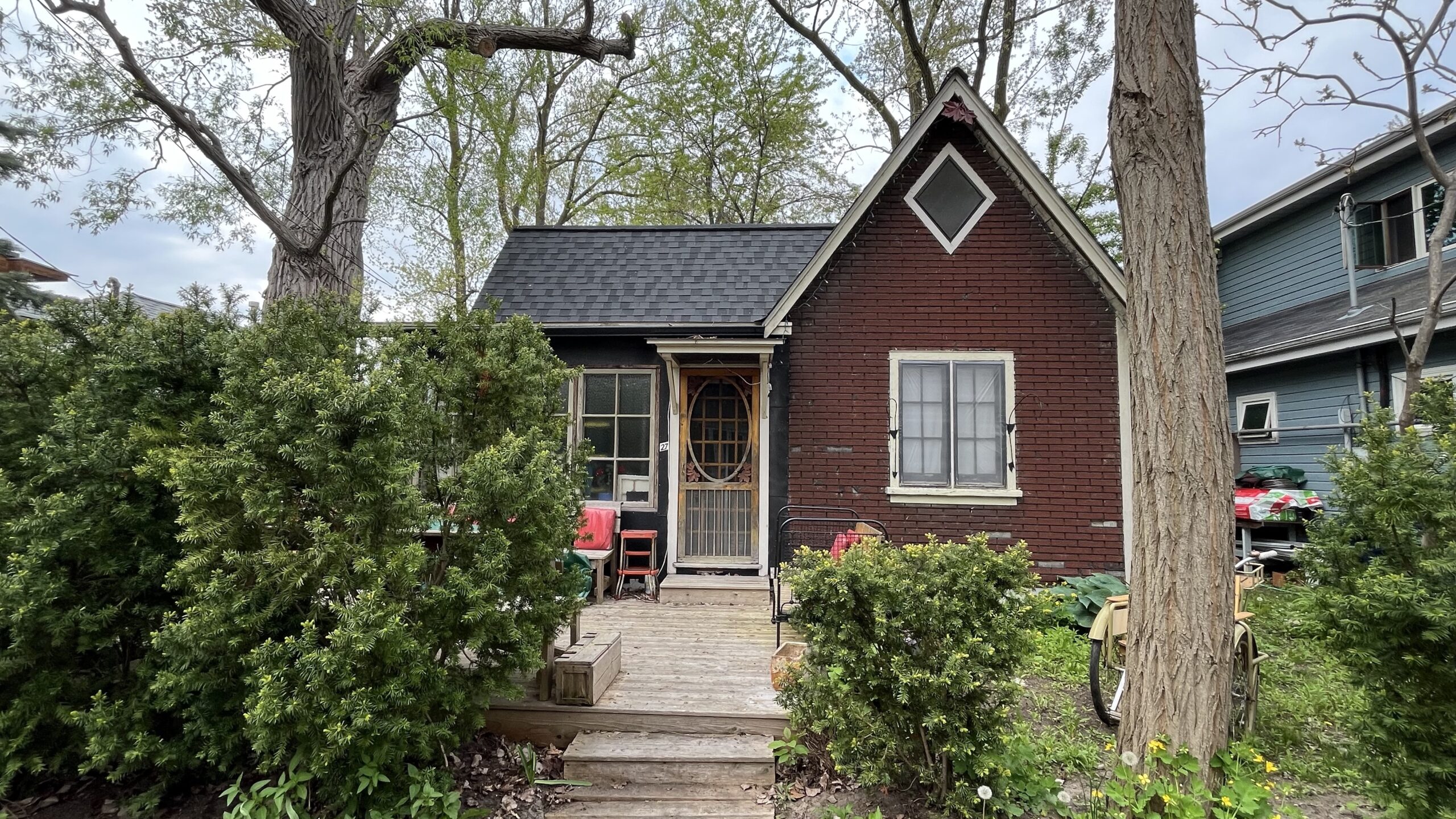 A small, brown home with an orange door on Wards Island, Toronto Islands, Toronto, ON, Canada