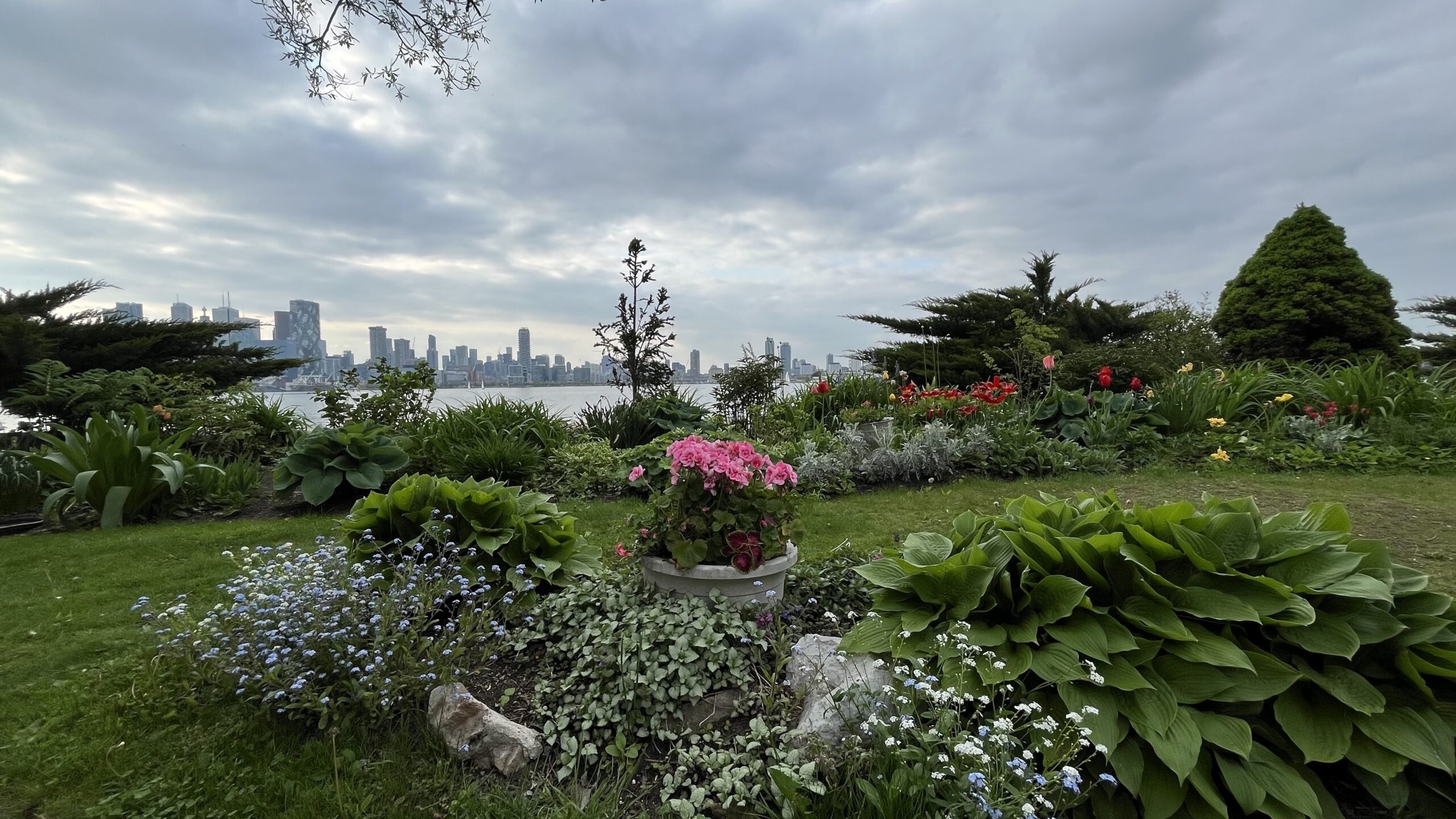 A view of the Toronto skyline as seen from Deenie & Freda’s Garden on Wards Island, Toronto Islands, Toronto, ON, Canada