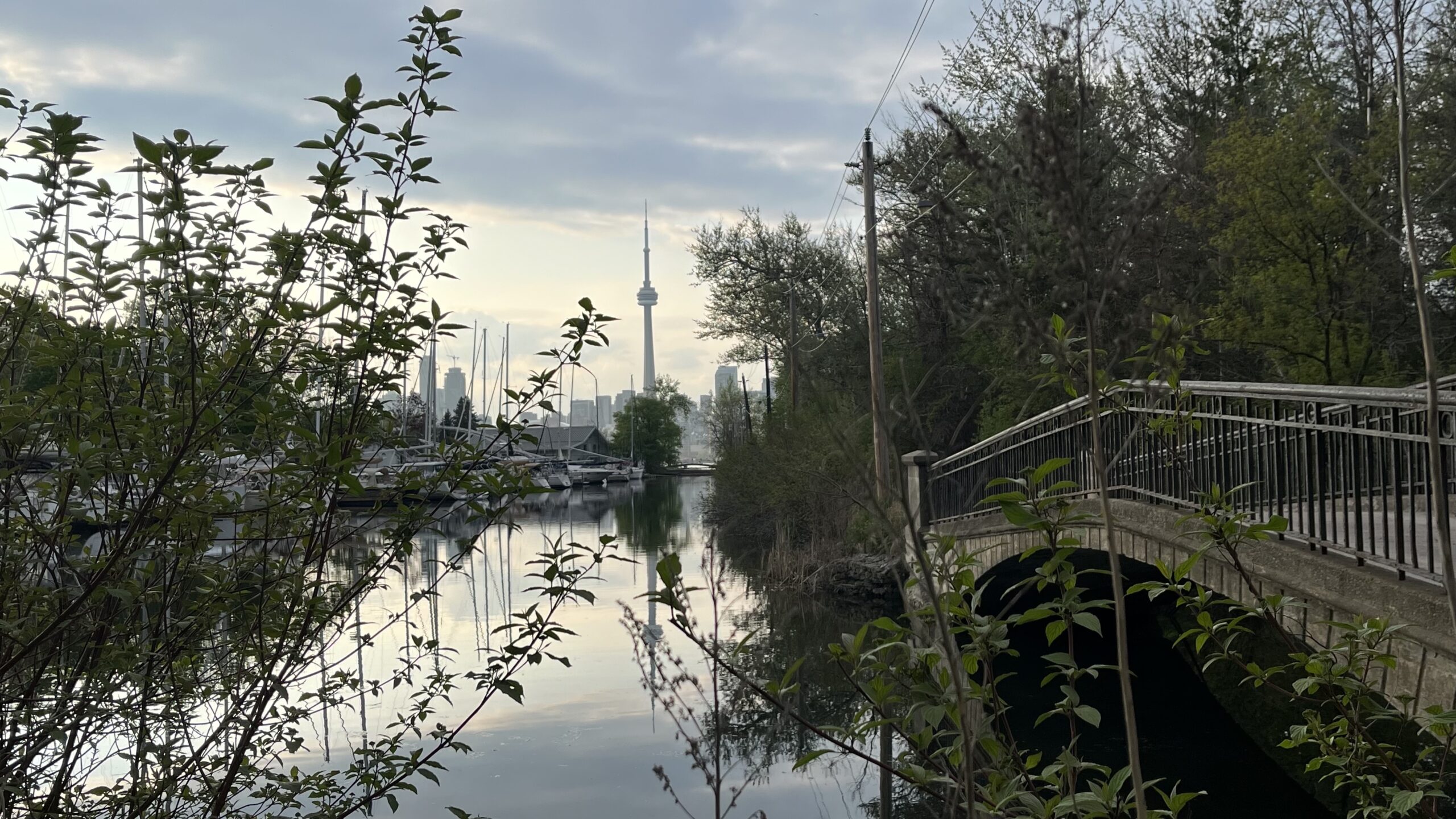 The Toronto skyline in the distance and a bridge on the right along the path from Wards Island to Centre Island, Toronto Islands, Toronto, ON, Canada