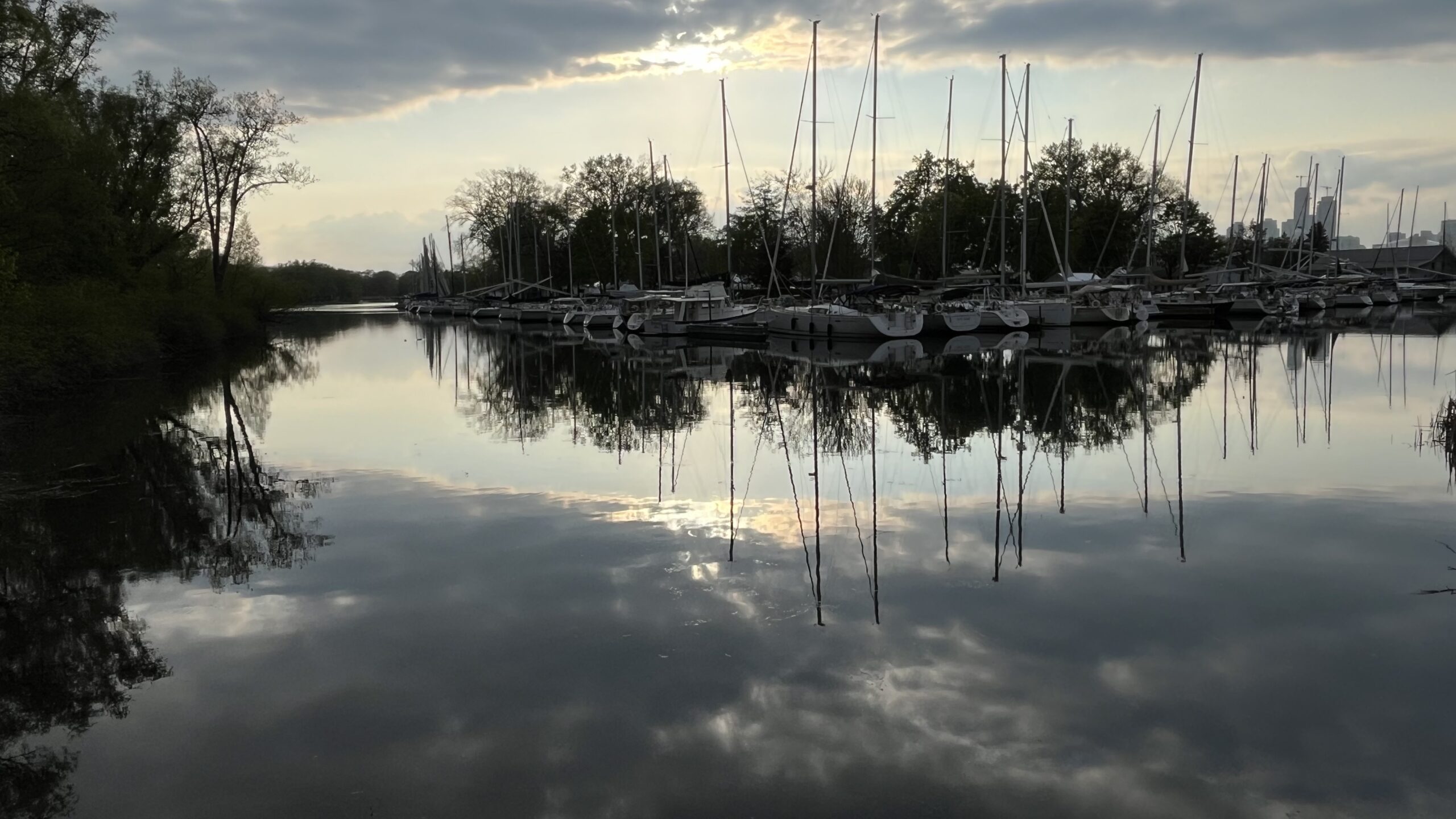 Boats, trees, clouds and the sun reflecting in the lake along the path from Wards Island to Centre Island, Toronto Islands, Toronto, ON, Canada