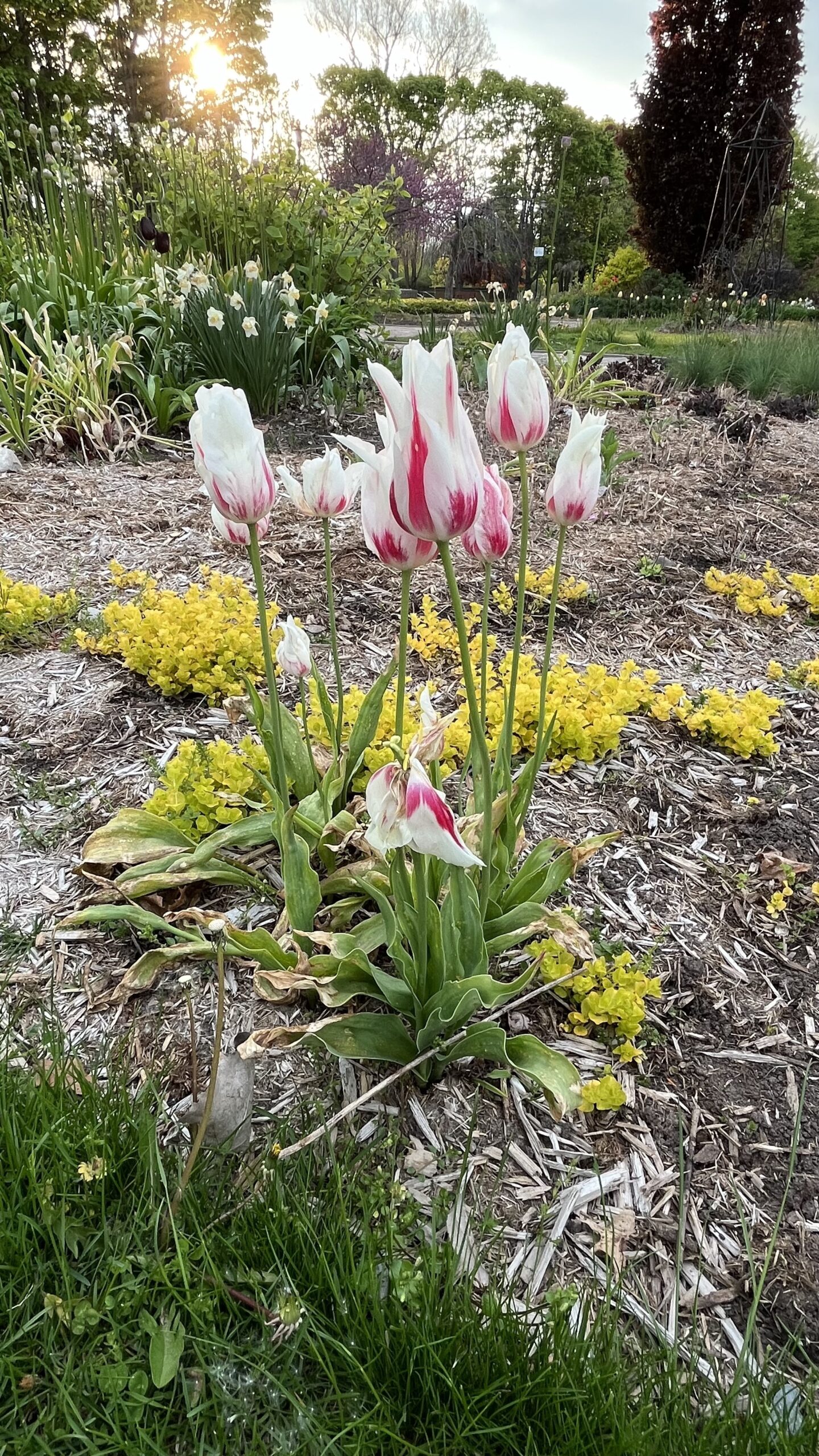 Sun shining through the trees with various flowers including red and white tulips at Avenue of the Islands Gardens, Toronto Islands, Toronto, ON, Canada