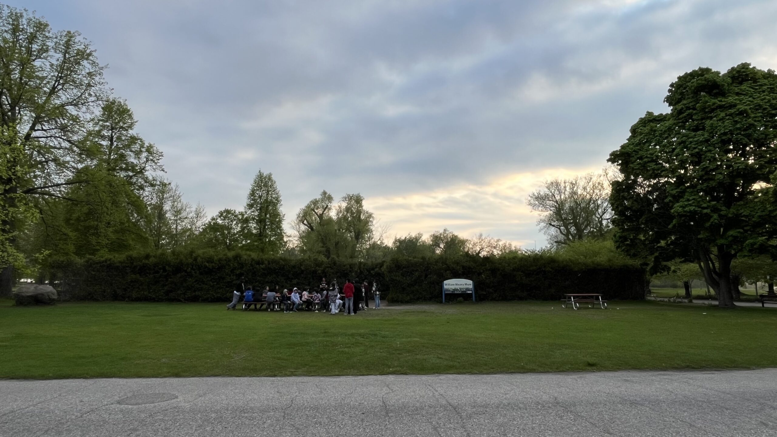 Children gathered in front of the William Meany Maze waiting to start a race through the maze, next to Avenue of the Islands Gardens, Toronto Islands, Toronto, ON, Canada