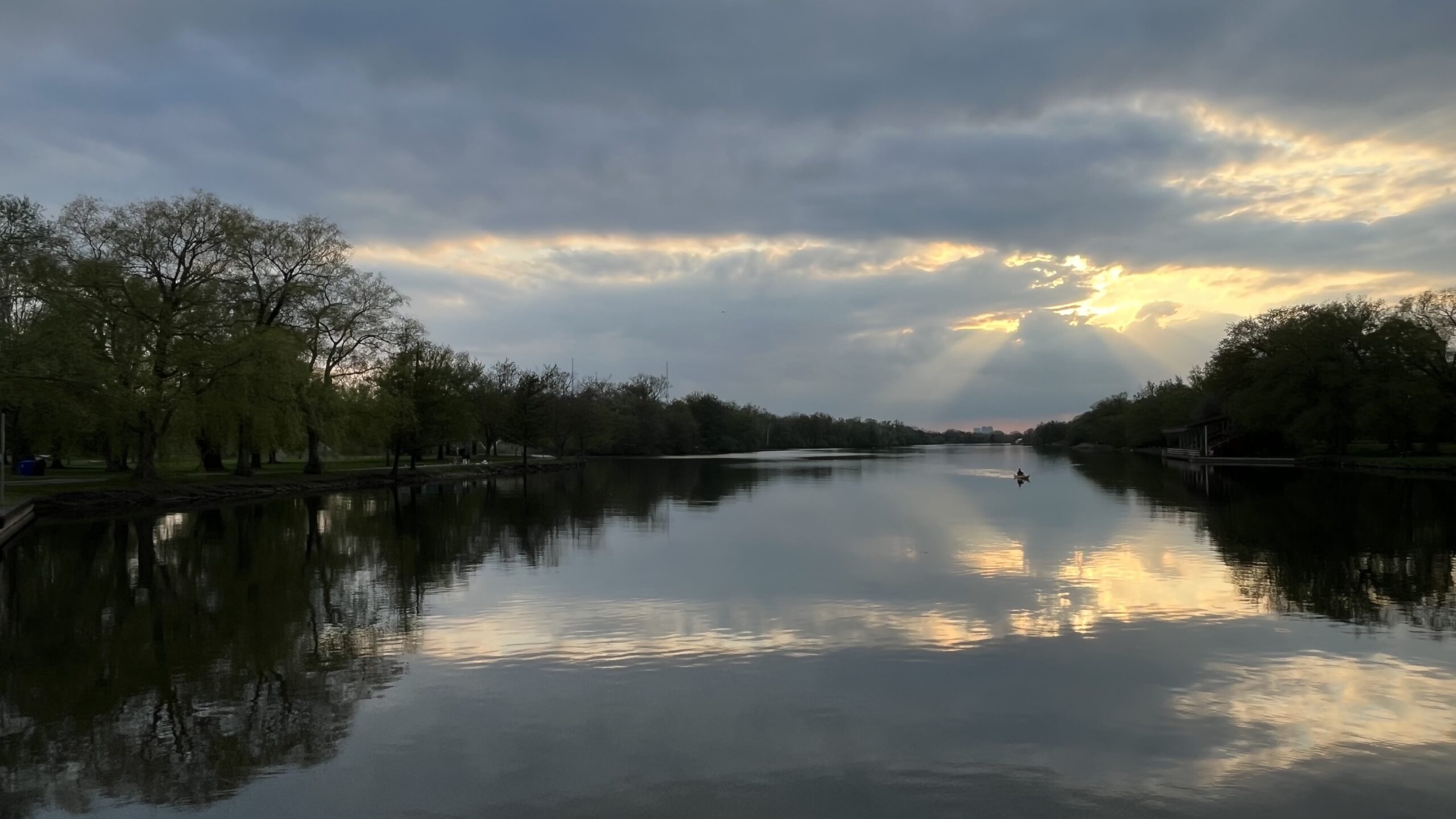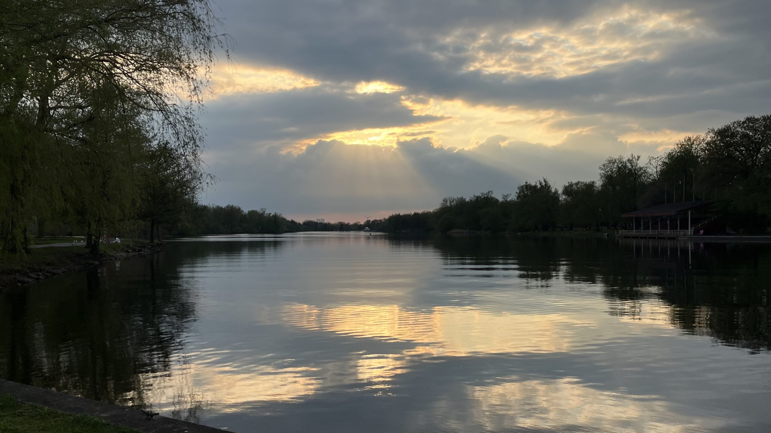 Sun rays shining through clouds with the sunlight, trees and clouds reflecting in water, Toronto Islands, Toronto, ON, Canada