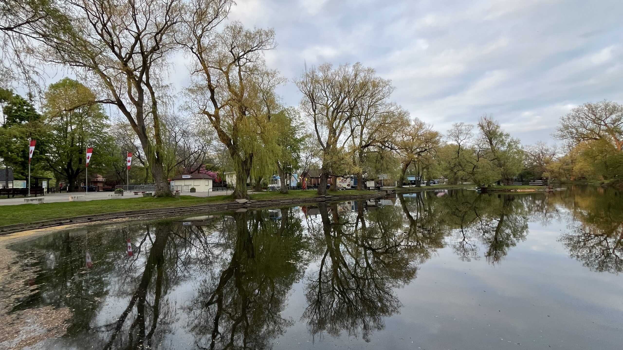 Trees and clouds reflecting in the water with part of Centreville Amusement Park in the distance on the left, Toronto Islands, Toronto, ON, Canada