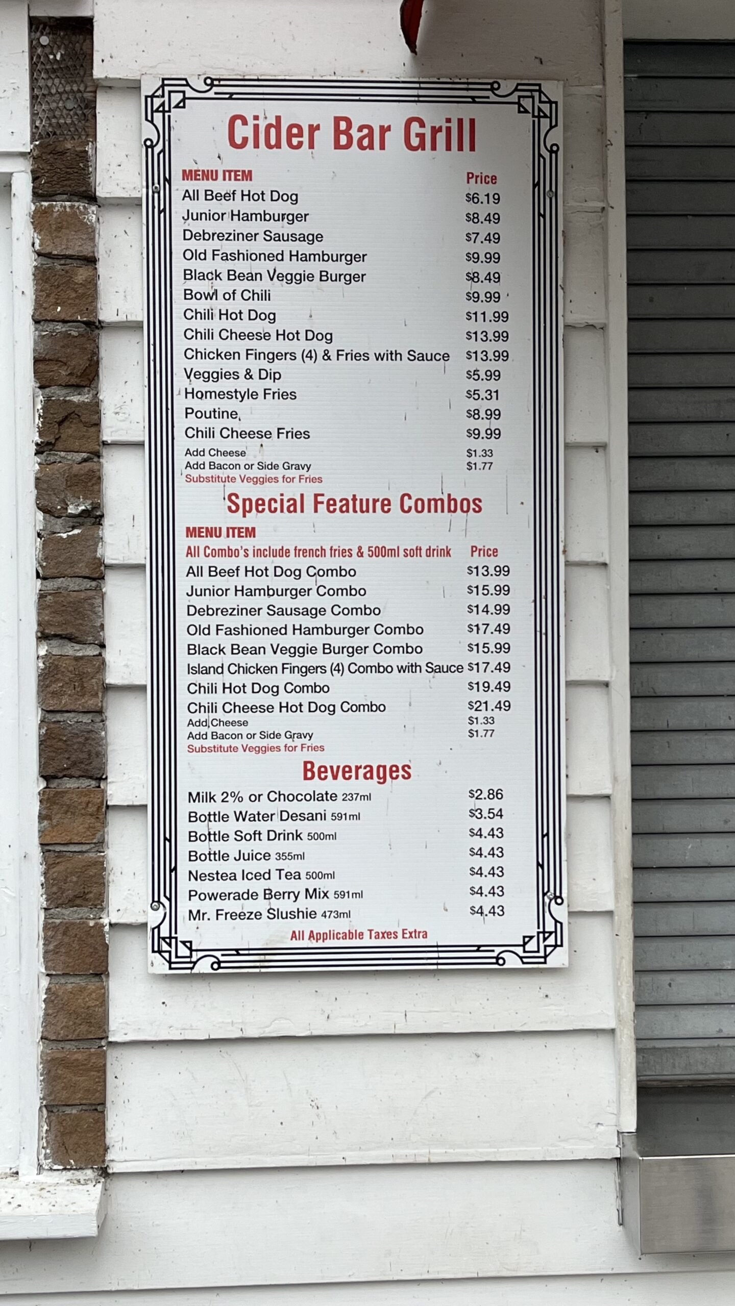 Menu for Cider Bar Grill, Centreville Amusement Park, Centreville Island, Toronto Islands, Toronto, ON, Canada