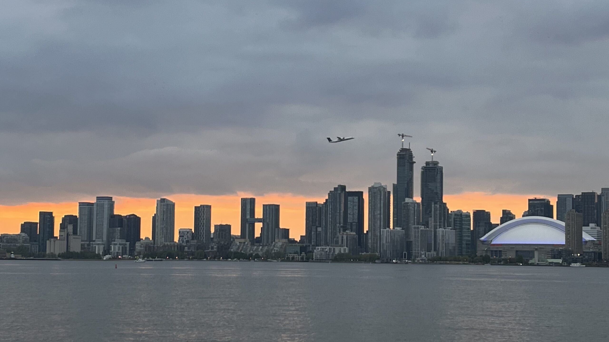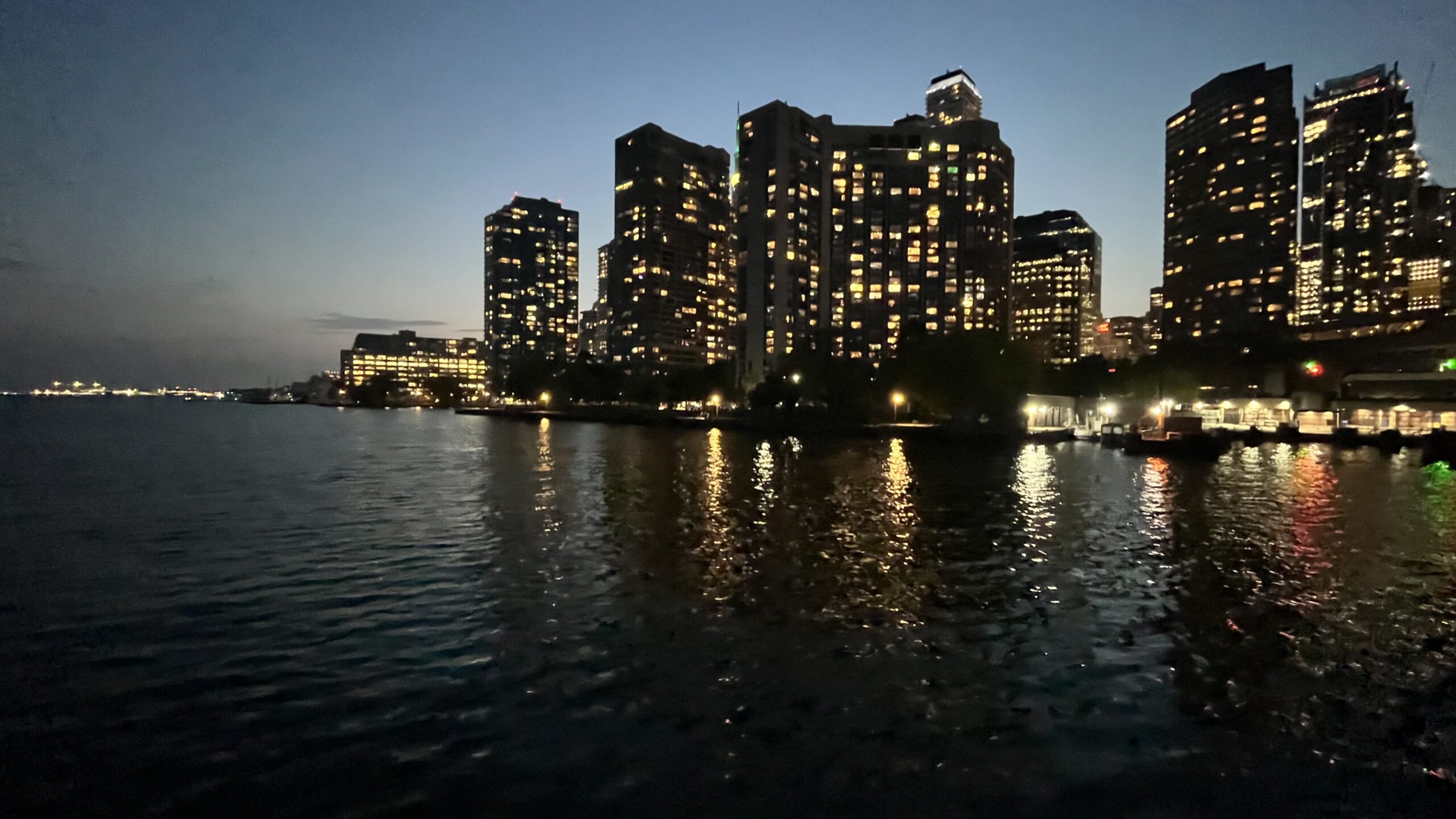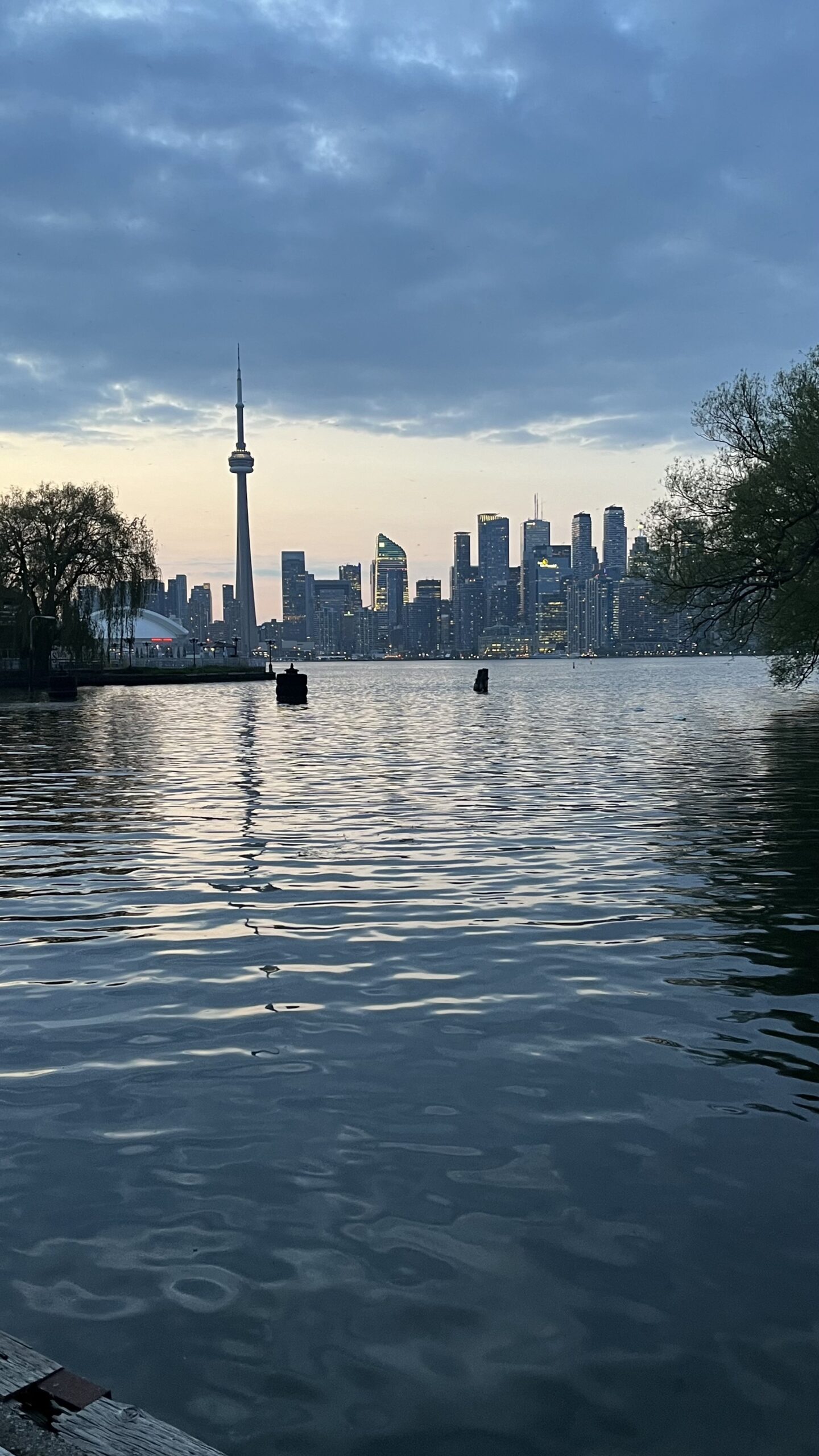 View of part of the Toronto skyline shortly after sunset as the ferry is about to dock at Jack Layton Ferry Terminal from the Toronto Islands, Toronto, ON, Canada