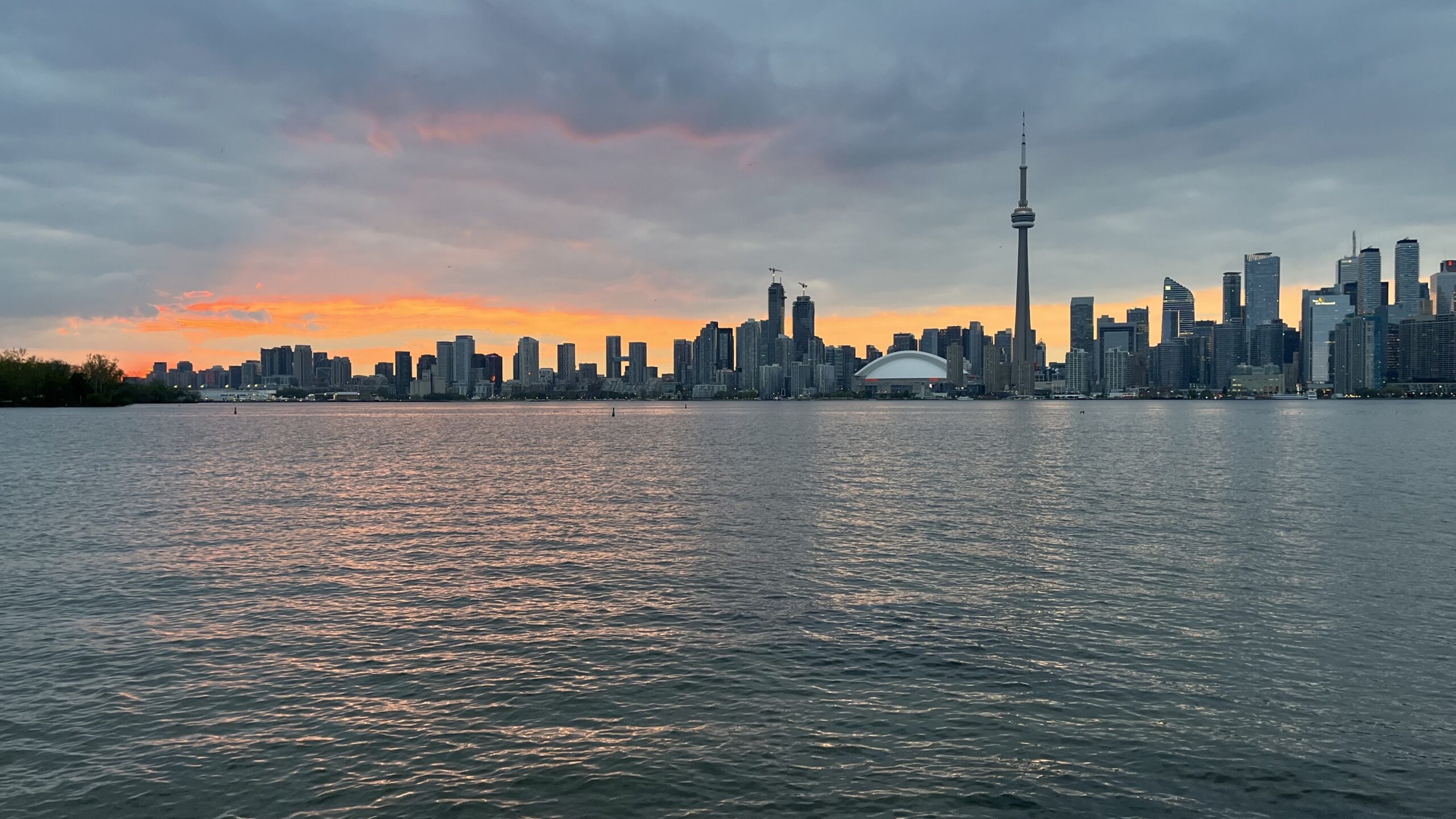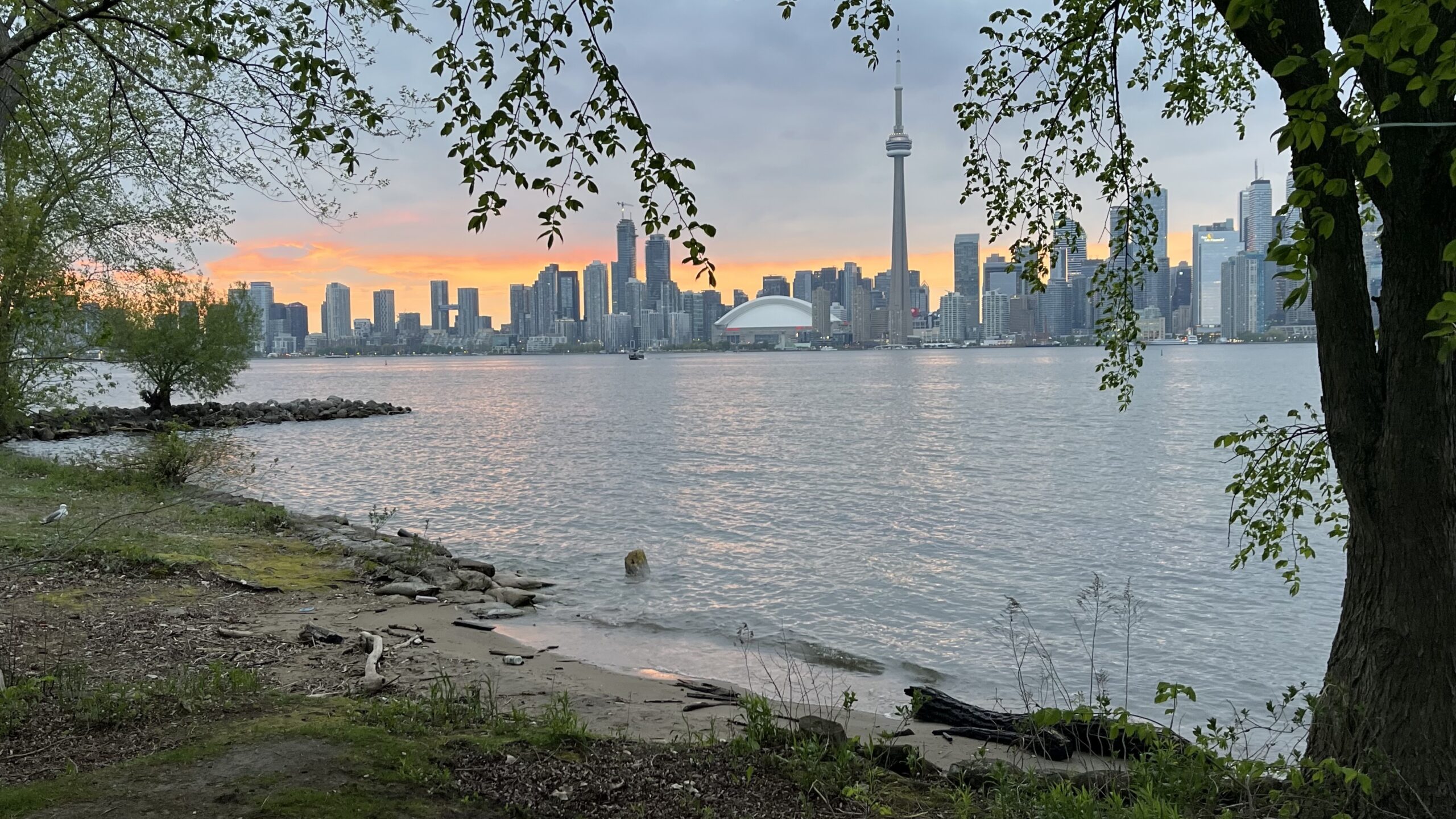 View of Toronto skyline at sunset from Olympic Island, Toronto Islands, Toronto, ON, Canada