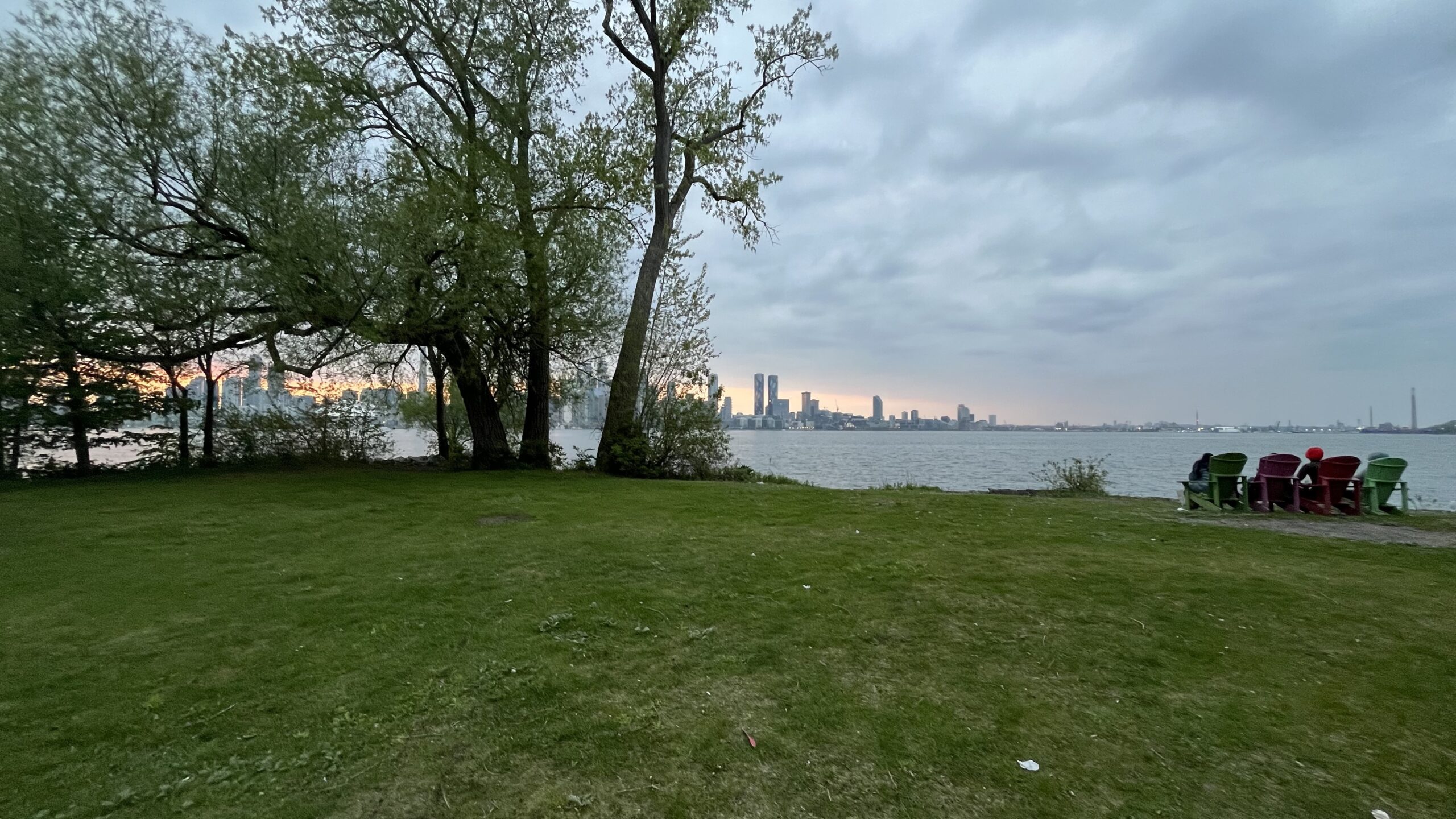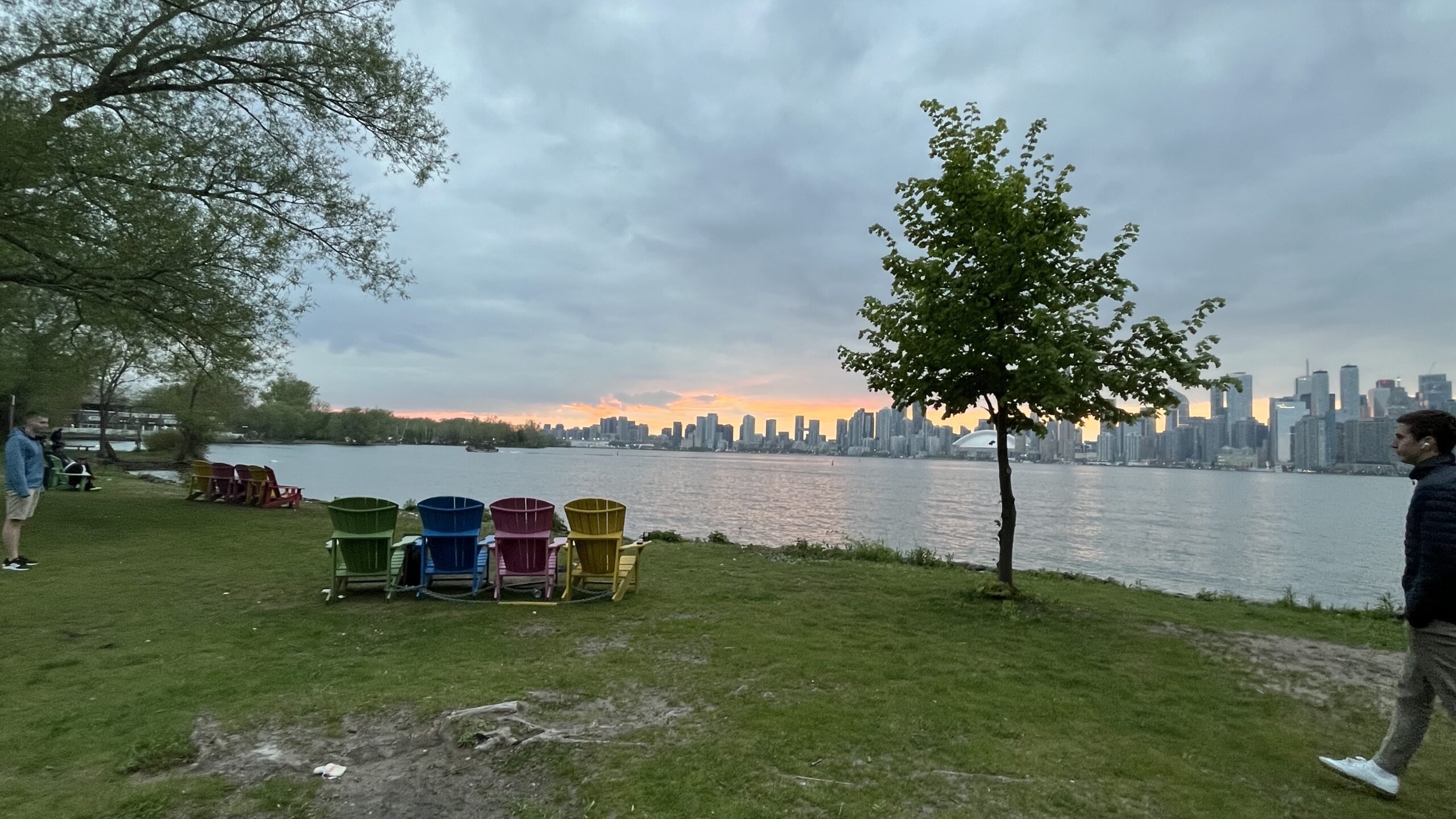 View of Toronto skyline at sunset in the distance and chairs to enjoy the view from on Olympic Island, Toronto Islands, Toronto, ON, Canada