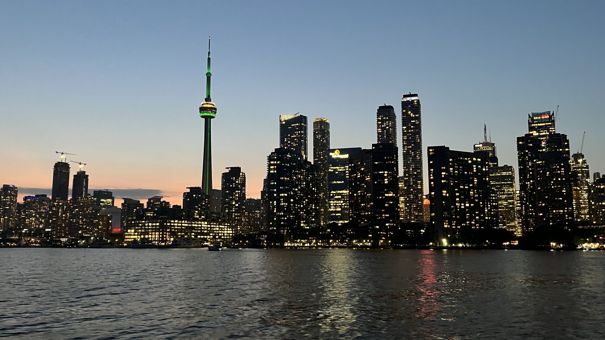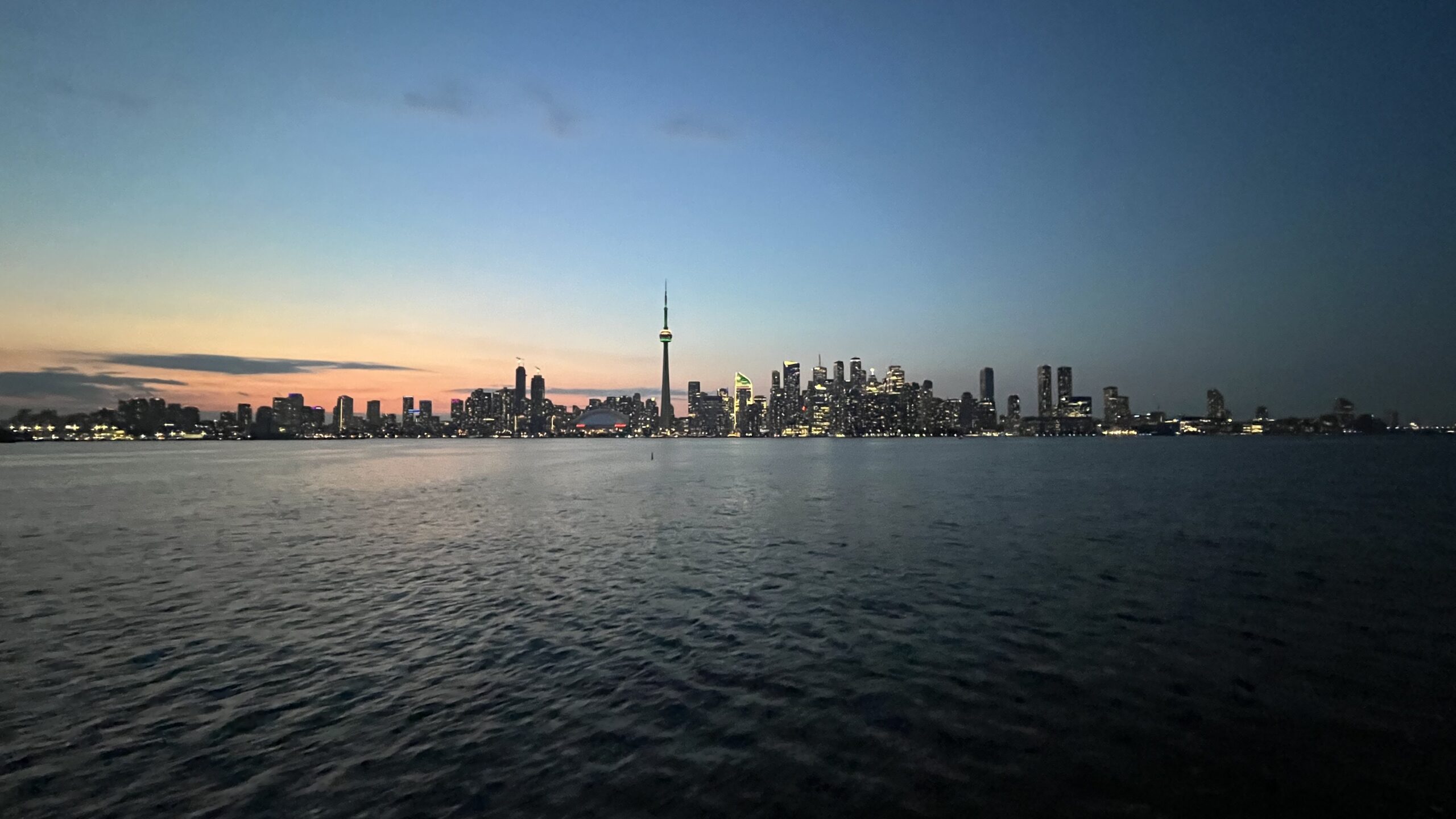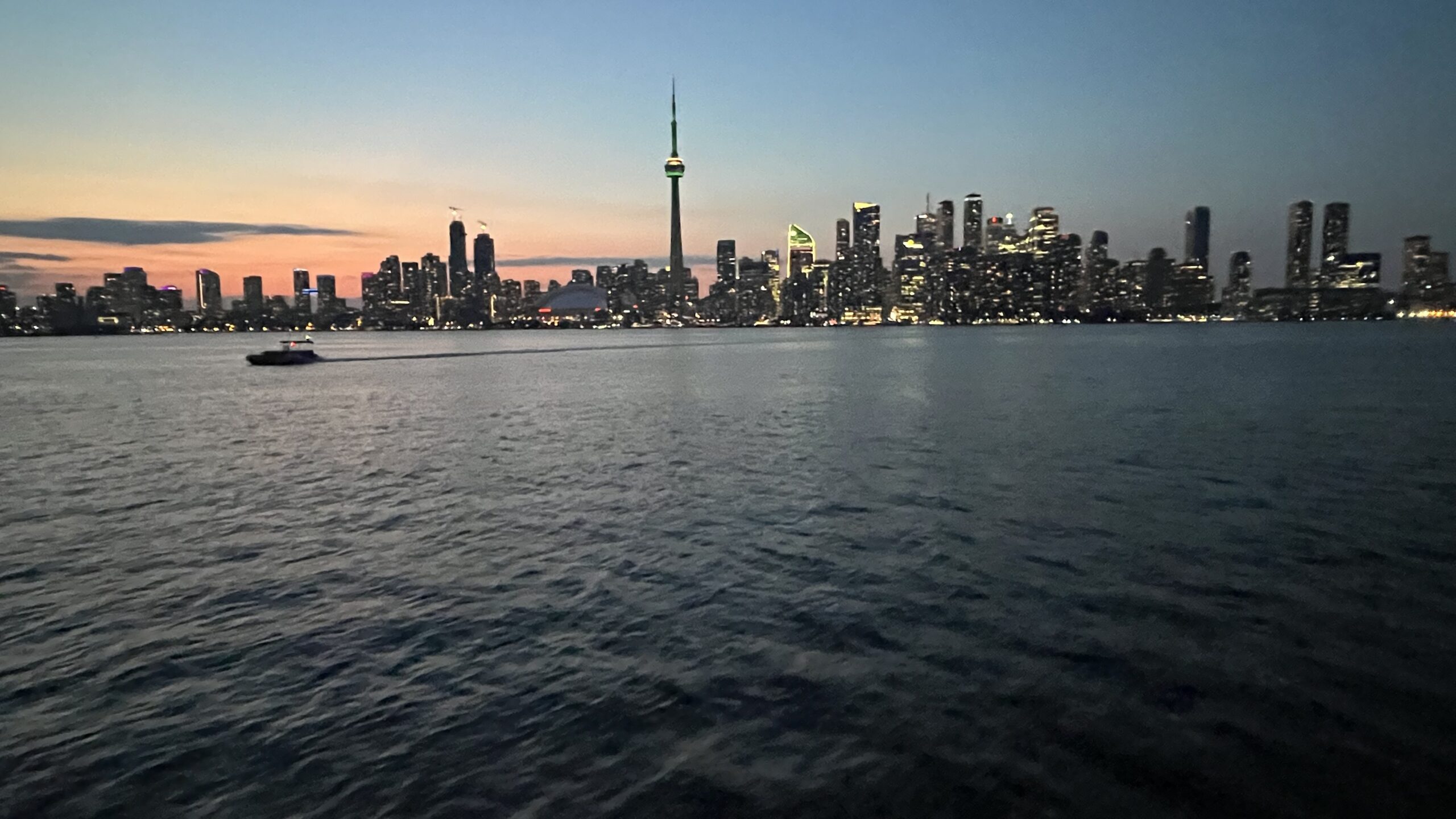 View of Toronto skyline shortly after sunset, including CN Tower, from the ferry ride from Centre Island Ferry Dock to Jack Layton Ferry Terminal, Toronto Islands, Toronto, ON, Canada