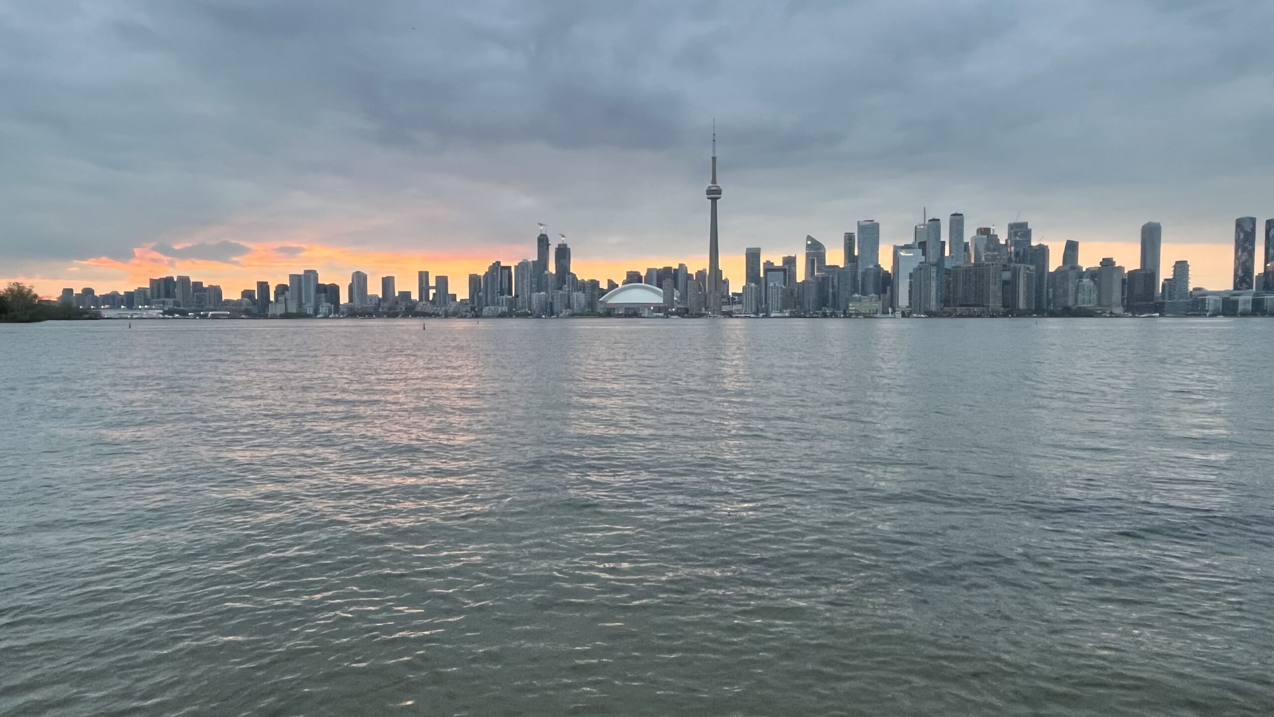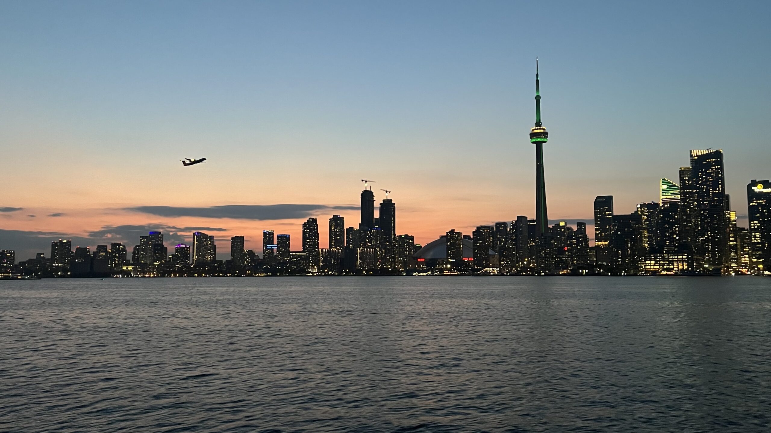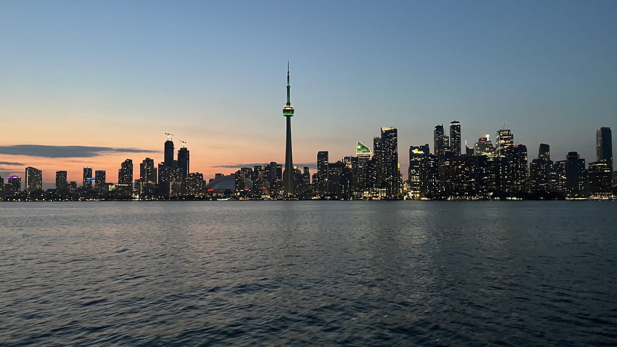View of Toronto skyline shortly after sunset, including CN Tower, from the ferry ride from Centre Island Ferry Dock to Jack Layton Ferry Terminal, Toronto Islands, Toronto, ON, Canada
