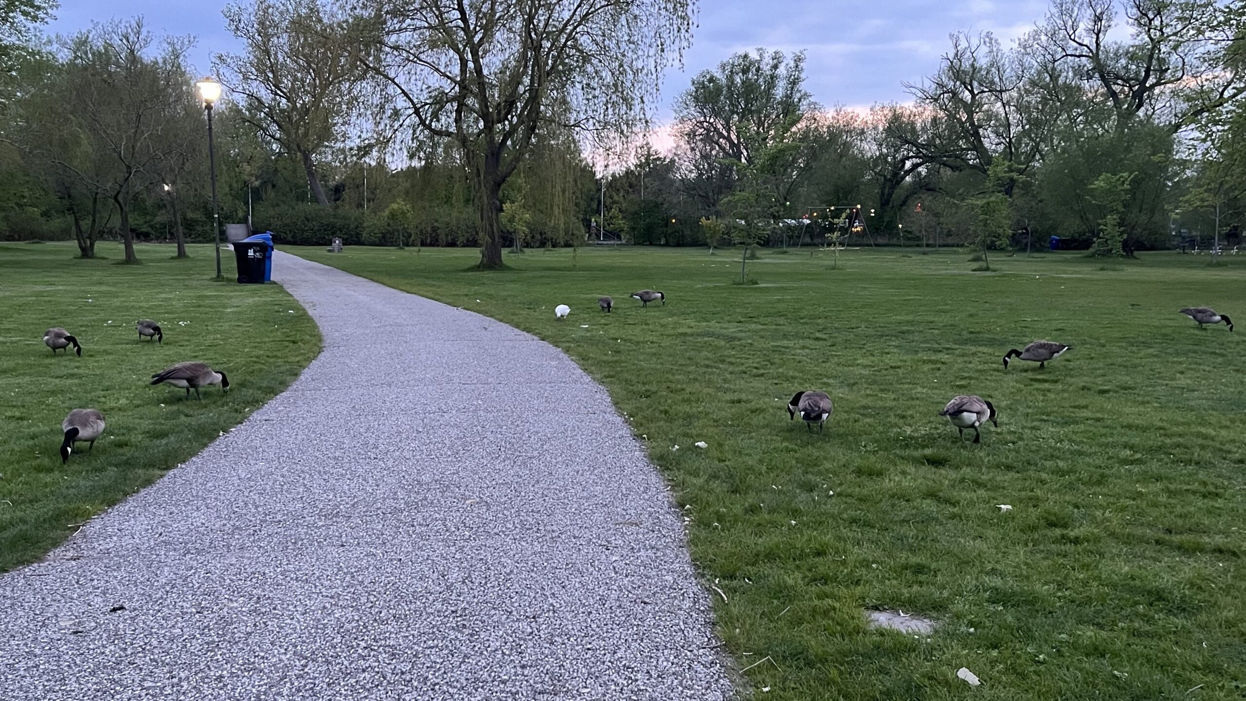 Pathway on Olympic Island with geese eating, Toronto Islands, Toronto, ON, Canada