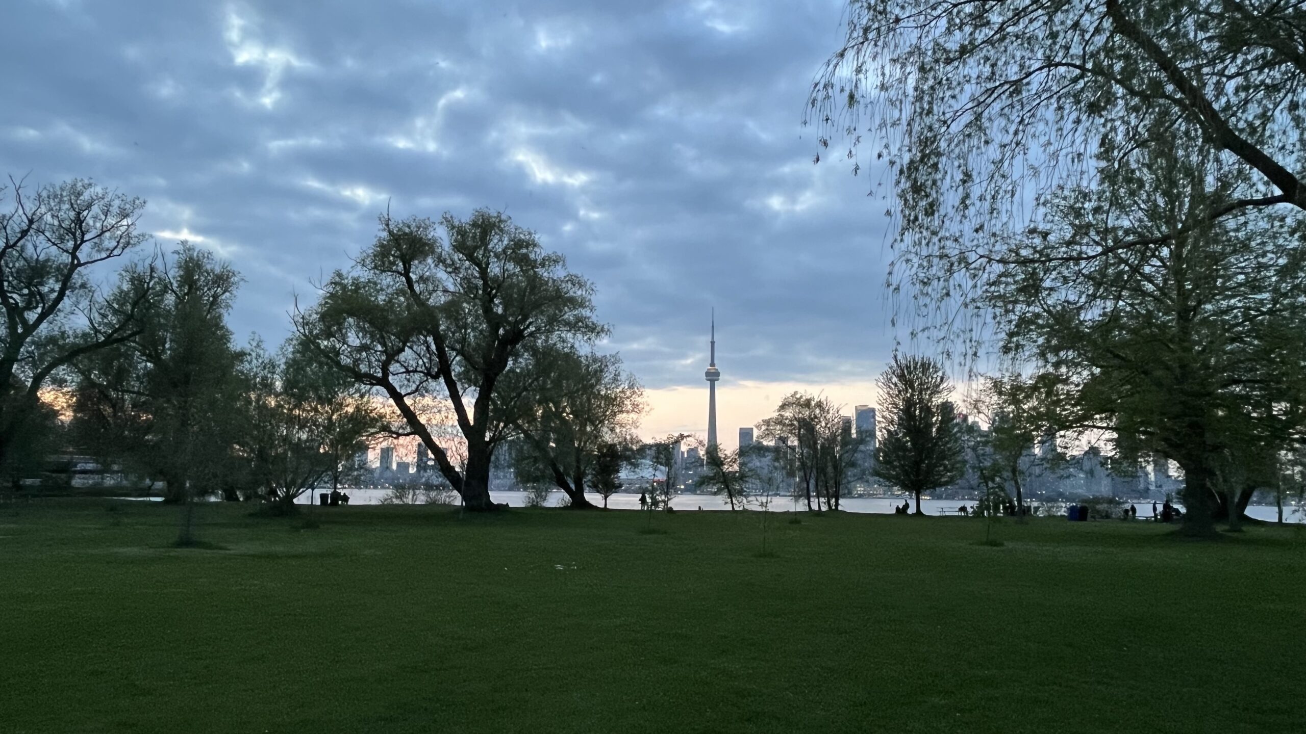 View of Toronto skyline at sunset and a grass field, Olympic Island, Toronto Islands, Toronto, ON, Canada