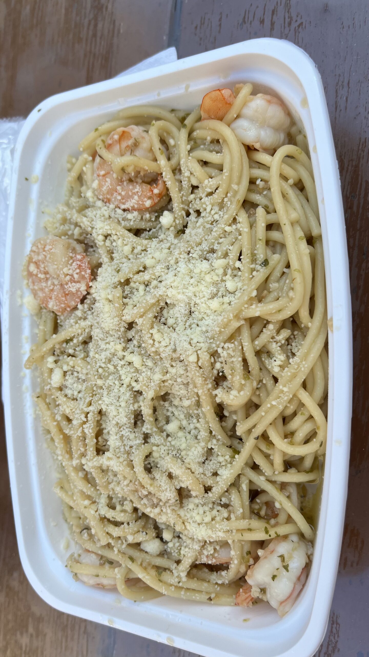 The other place we tried food from was D’Brew. My husband ordered the garlic butter shrimp pasta. They showed fresh basil in their photo of it, and my husband asked before he ordered if the photo was accurate and if it really does have fresh basil in it. The woman said yes, fresh basil is what they use in it. When he started to eat the pasta he immediately saw, and tasted, that there was no fresh basil in his pasta dish, only dried basil. When he brought this to the woman’s attention, she assured him that it’s fresh basil because that’s all they use. Right there on the counter was a bottle of dried basil! So my husband asked her to show him the fresh basil they have. She said she just put it back into the refrigerator. After digging for quite some time and searching on different shelves of the refrigerator, she finally pulled out a small batch of fresh basil. If she had just used fresh basil, I would think she would have known where it was stored without having to search so long for it. Plus, it was unquestionably dried basil. It was also made with garlic powder, and the shrimp were rubbery. It was not good at all.