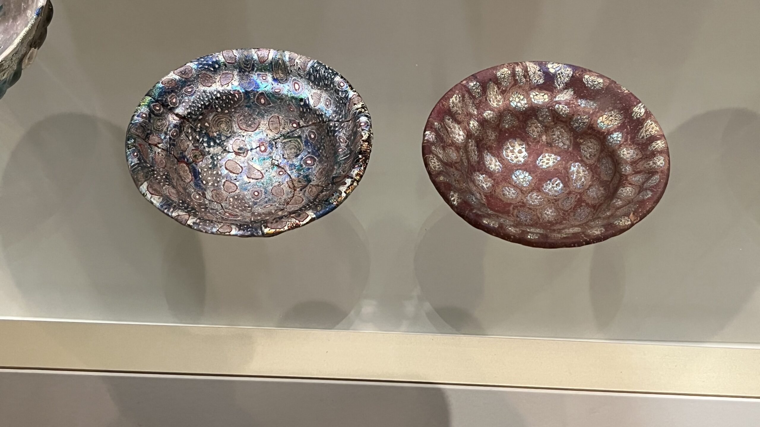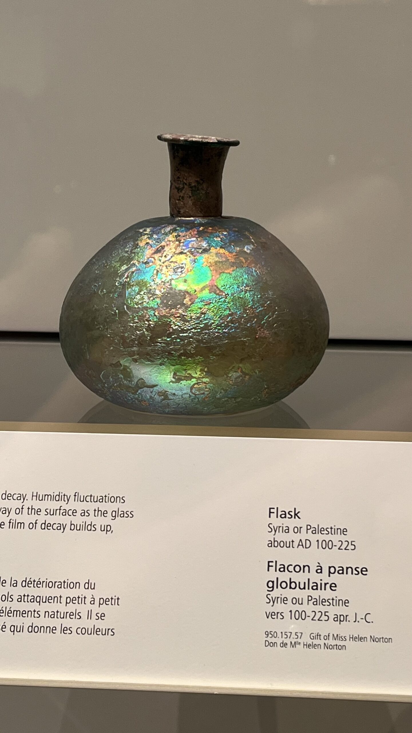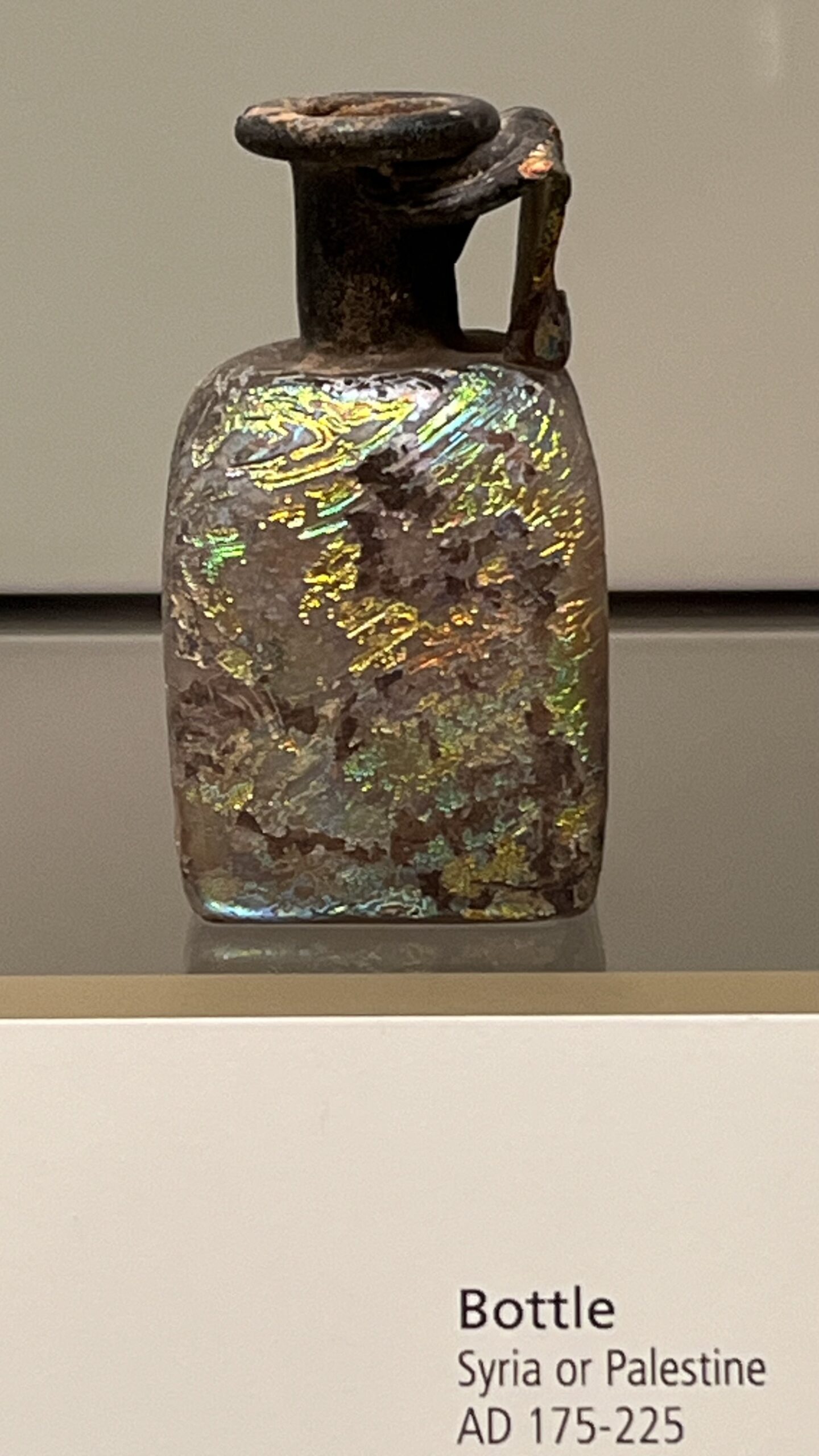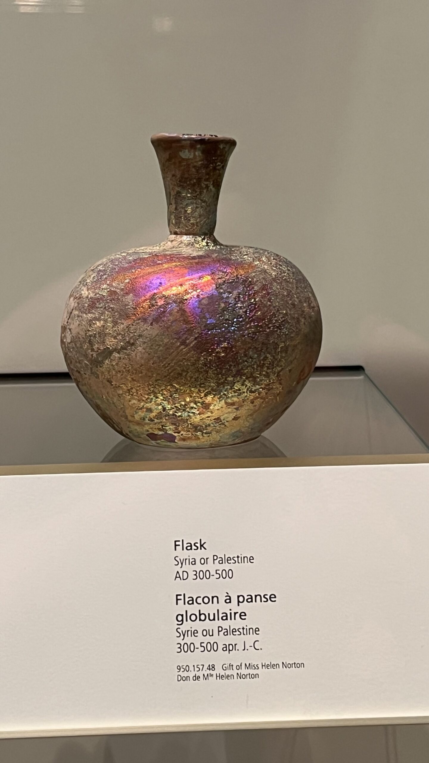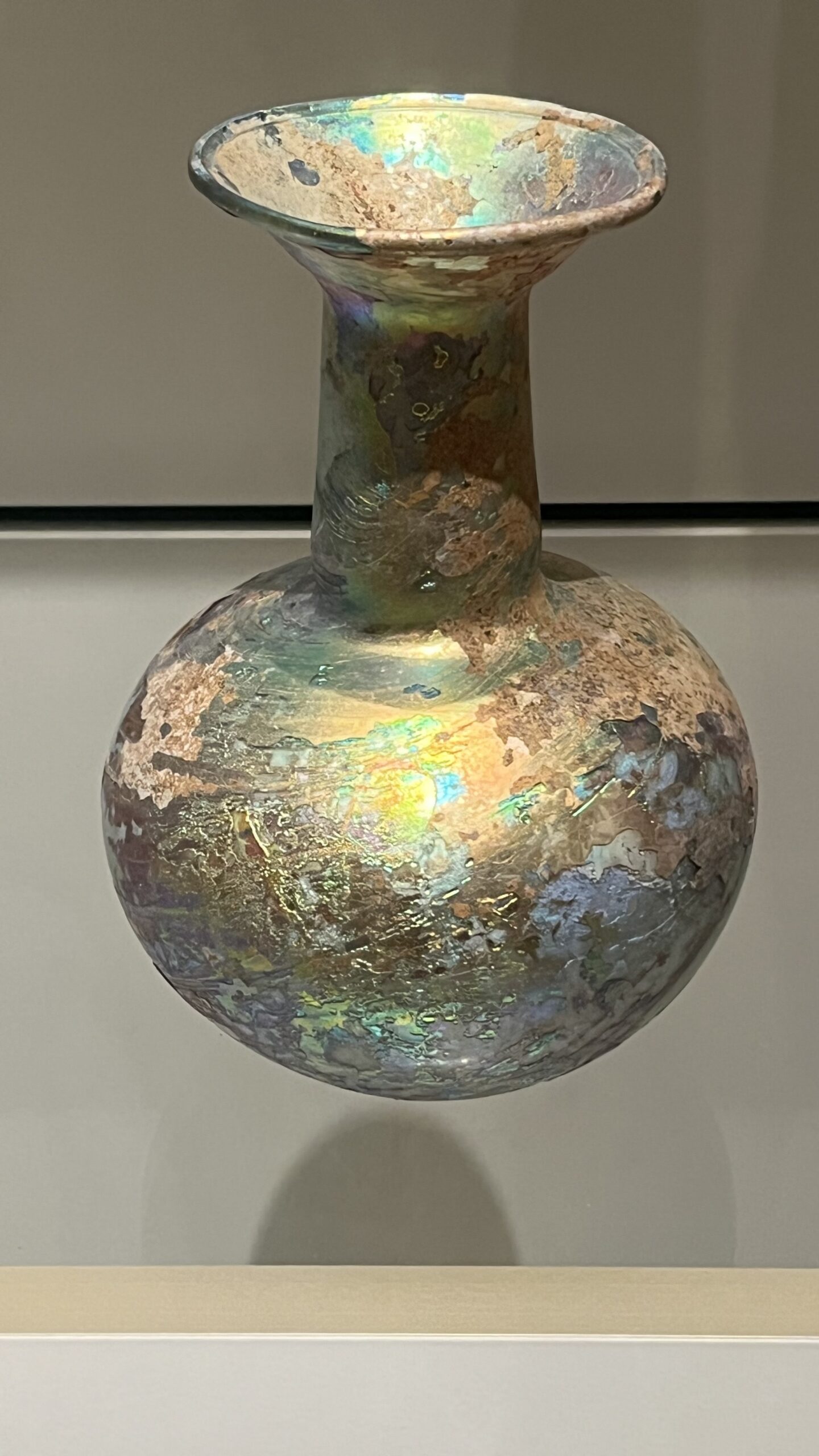 Next we entered an area that I took tons of photos in – a gallery of vases and other similar items throughout the millenniums. Some of the pieces were so beautiful! There are, of course, vases ranging in size from very small to much larger. And, of course, vases of varying materials are on display as well as a lovely variety of finishes – some of the iridescent ones were so striking.