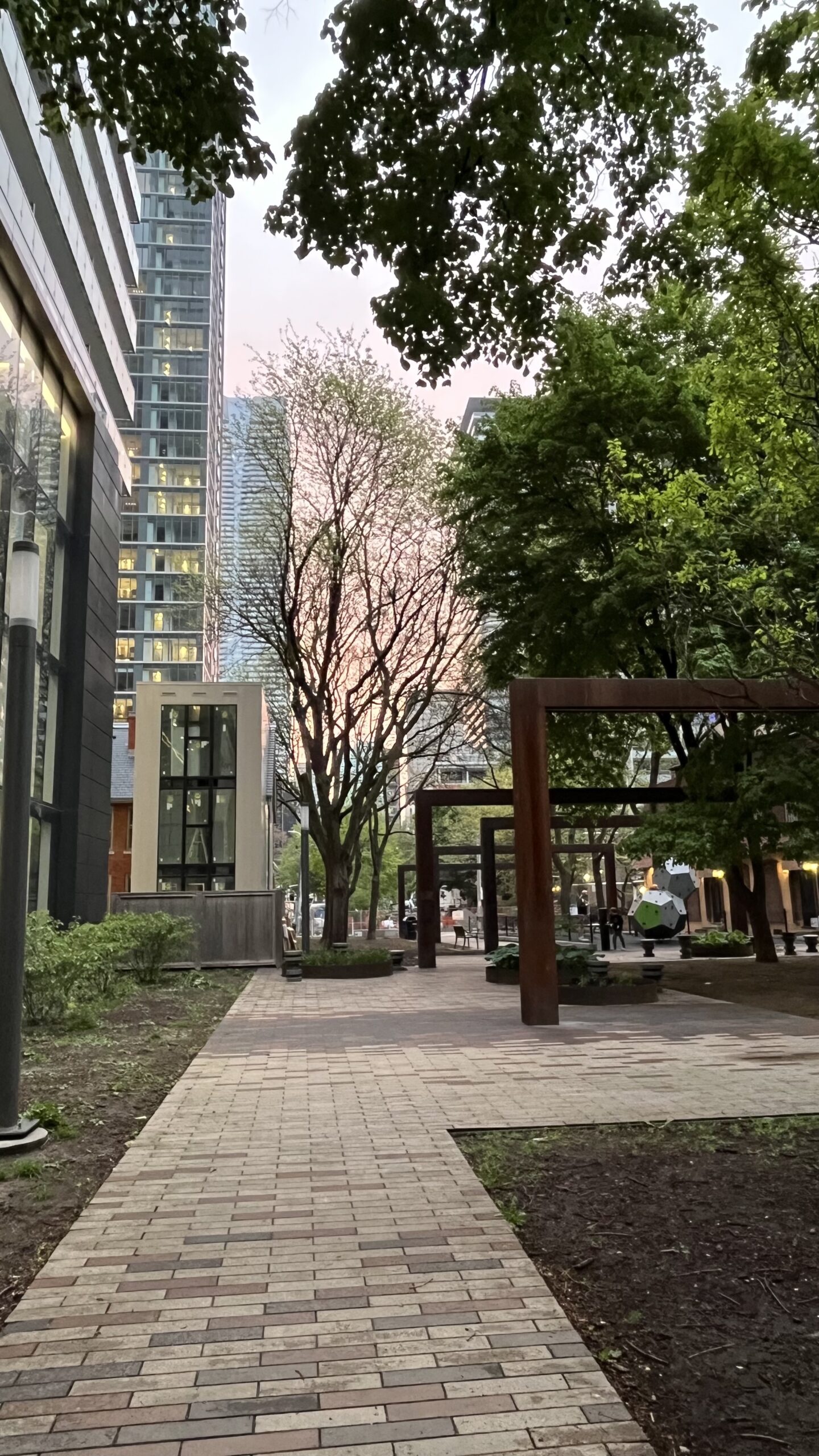 On the way back to our car we came across this quaint park that was right next to the parking garage we parked at. The park is called James Canning Gardens. It’s nothing extra special, but it’s a nice little, quiet park (at least quiet when we were there) in the middle of a bustling city. I thought it looked nice how the colors in the sky from the setting sun look at the end of one of the photos as a backdrop to the park.