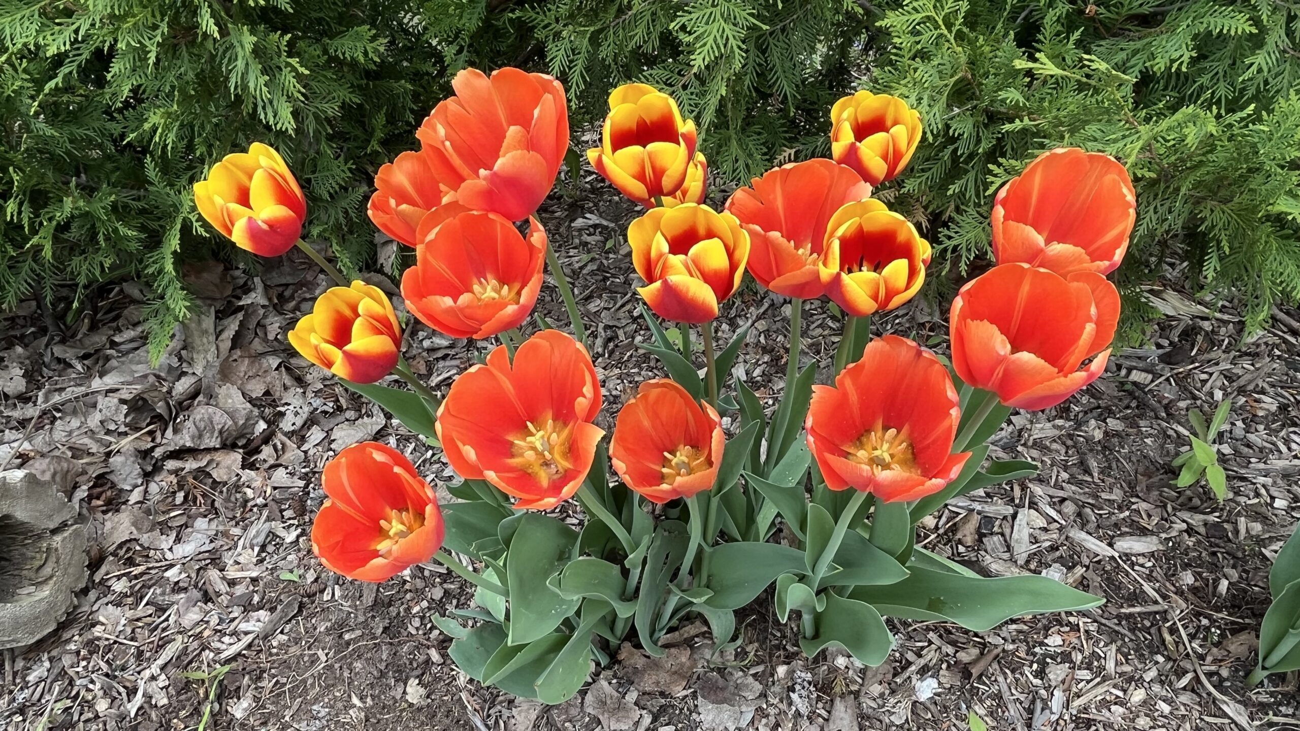 Dark orange and yellow tulips outside the greenhouse at the Toronto Zoo, Toronto, ON, Canada