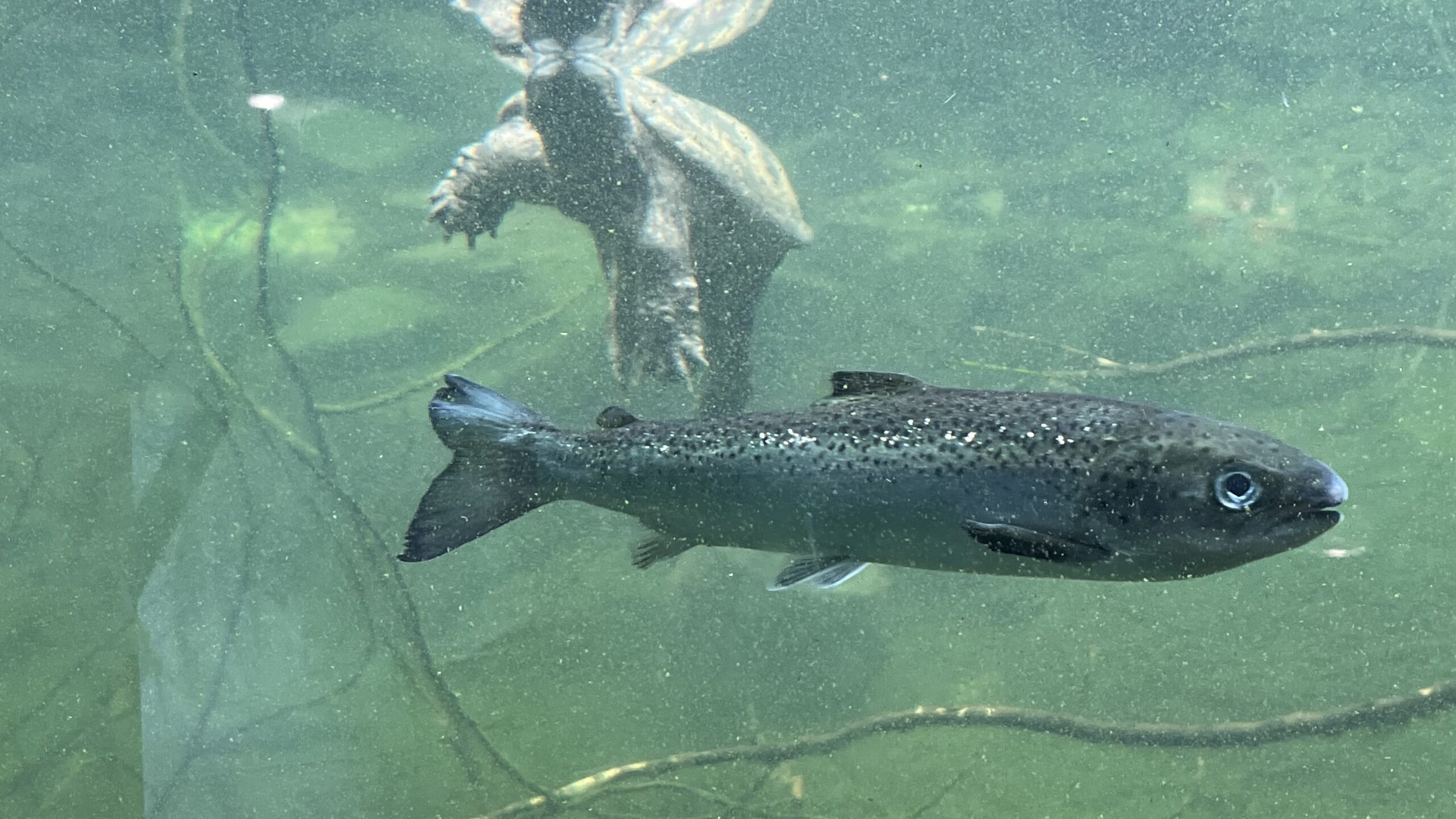 A turtle and a fish both swimming in the Americas section of the Toronto Zoo, Toronto, ON, Canada